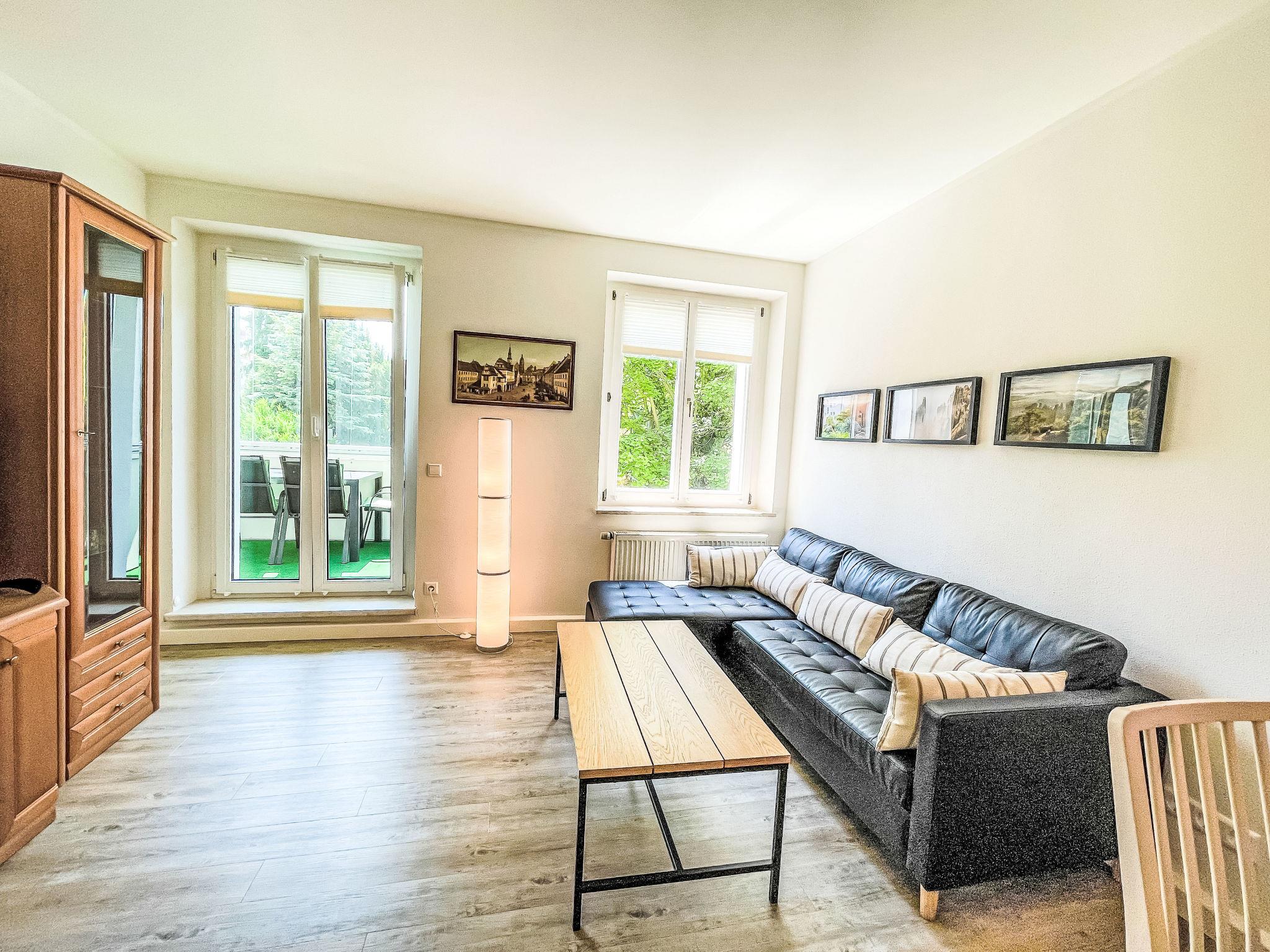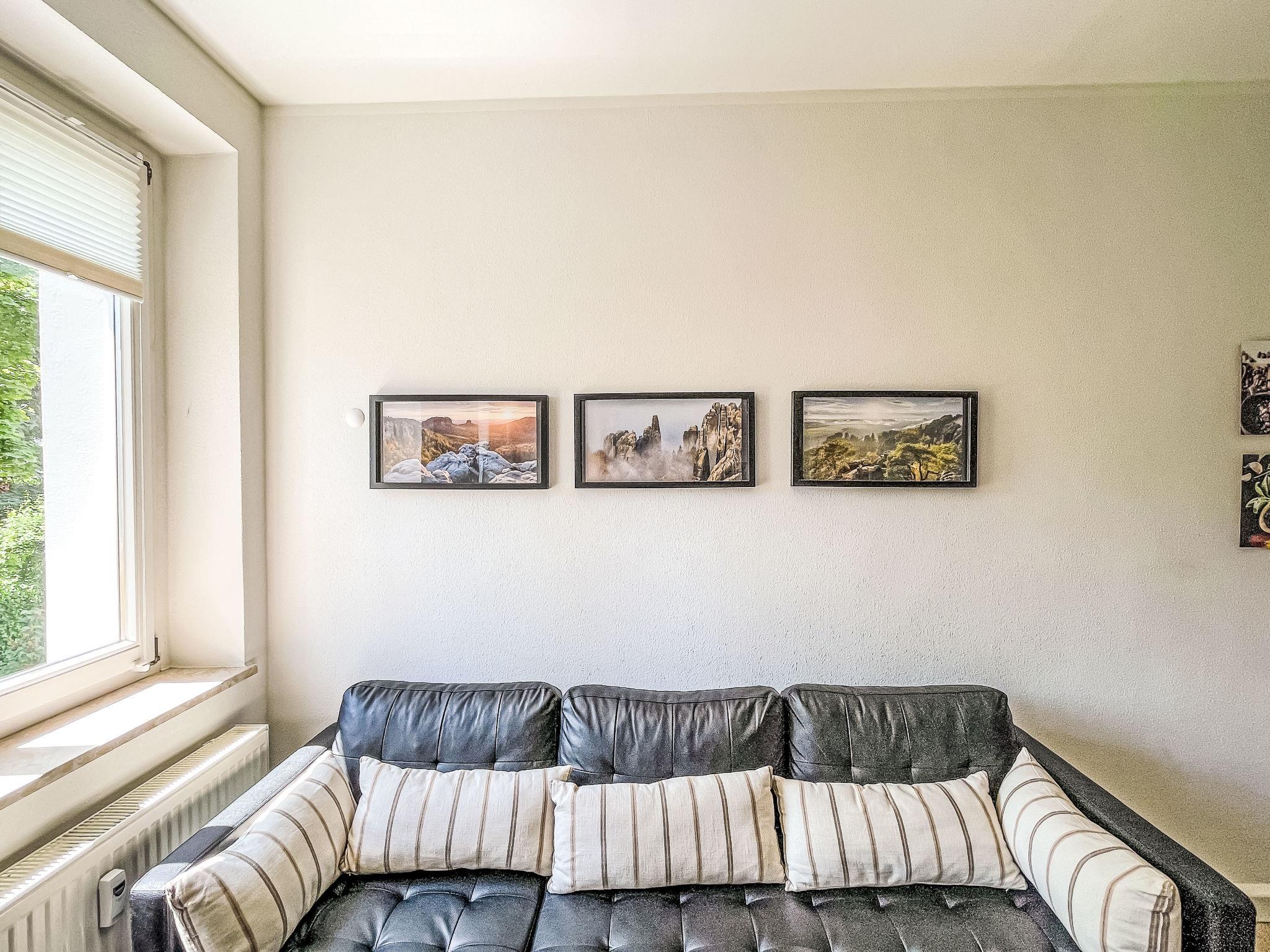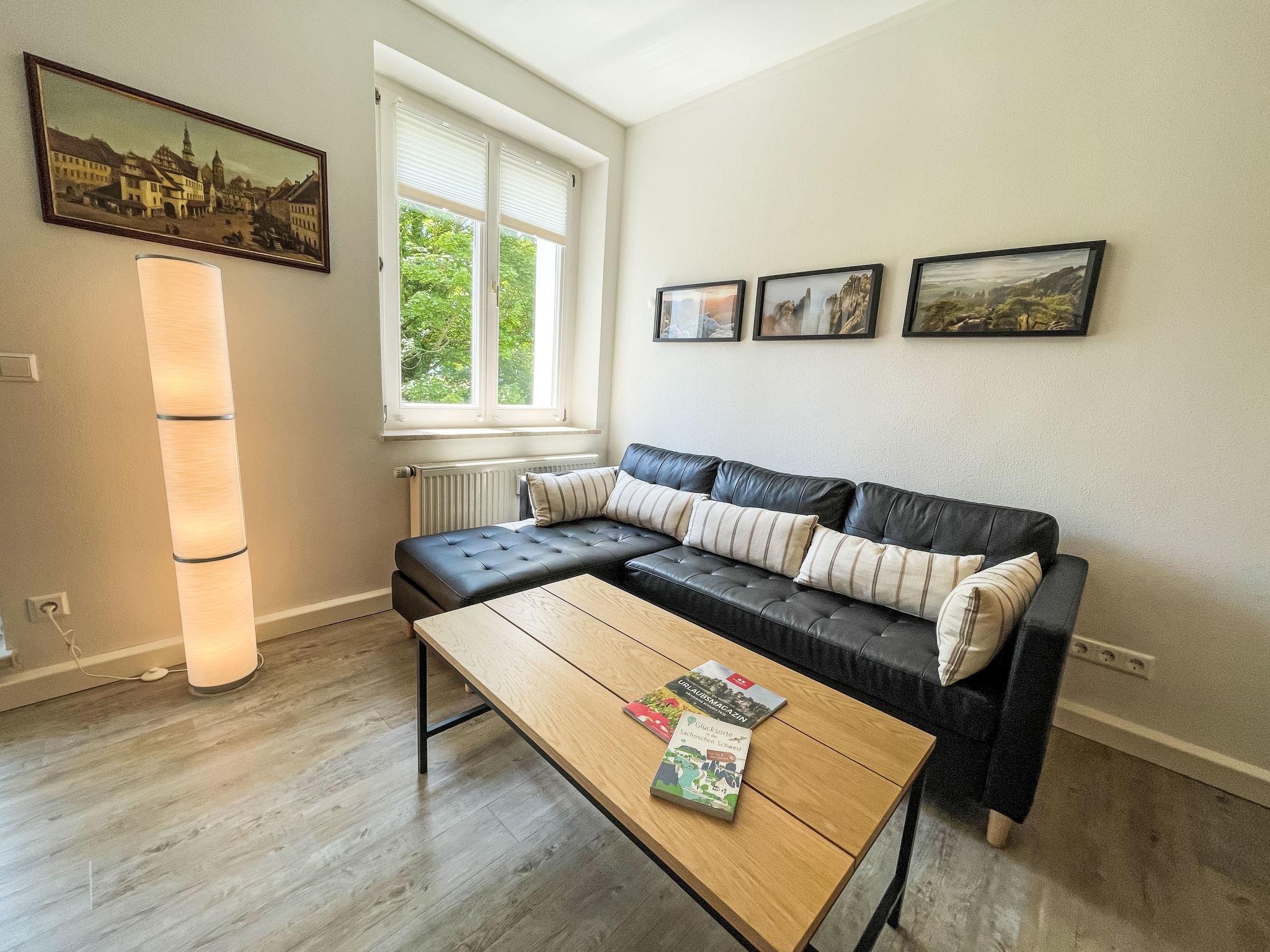 "Stadtwohnung in Pirna", 3-room apartment on 1st floor. Bright, very beautiful and cosy furnishings: large living/dining room with dining table and cable TV (flat screen), radio. Exit to the balcony. 1 room with 2 beds (90 cm, length 200 cm). 1 room with 1 double bed (2 x 90 cm, length 180 cm). Kitchen (oven, dishwasher, 4 ceramic glass hob hotplates, kettle, microwave, electric coffee machine). Shower/WC. Underfloor heating. Parquet floors. Small balcony 6 m2. Balcony furniture, covered balcony. Beautiful view of the garden. Facilities: washing machine, dryer. Internet (WiFi, free). Parking (1 car) at the house. Please note: non-smokers only. Smoke alarm.