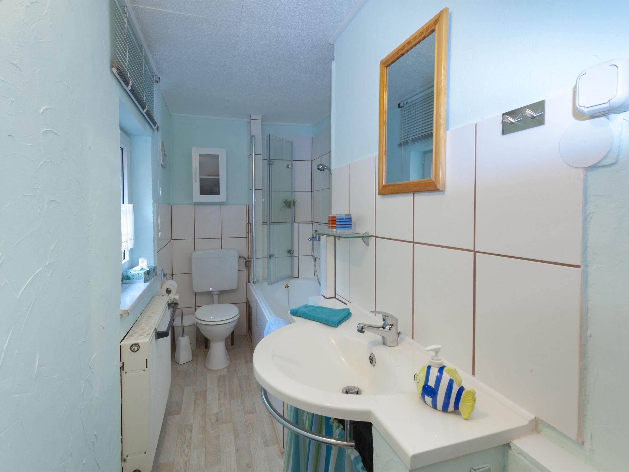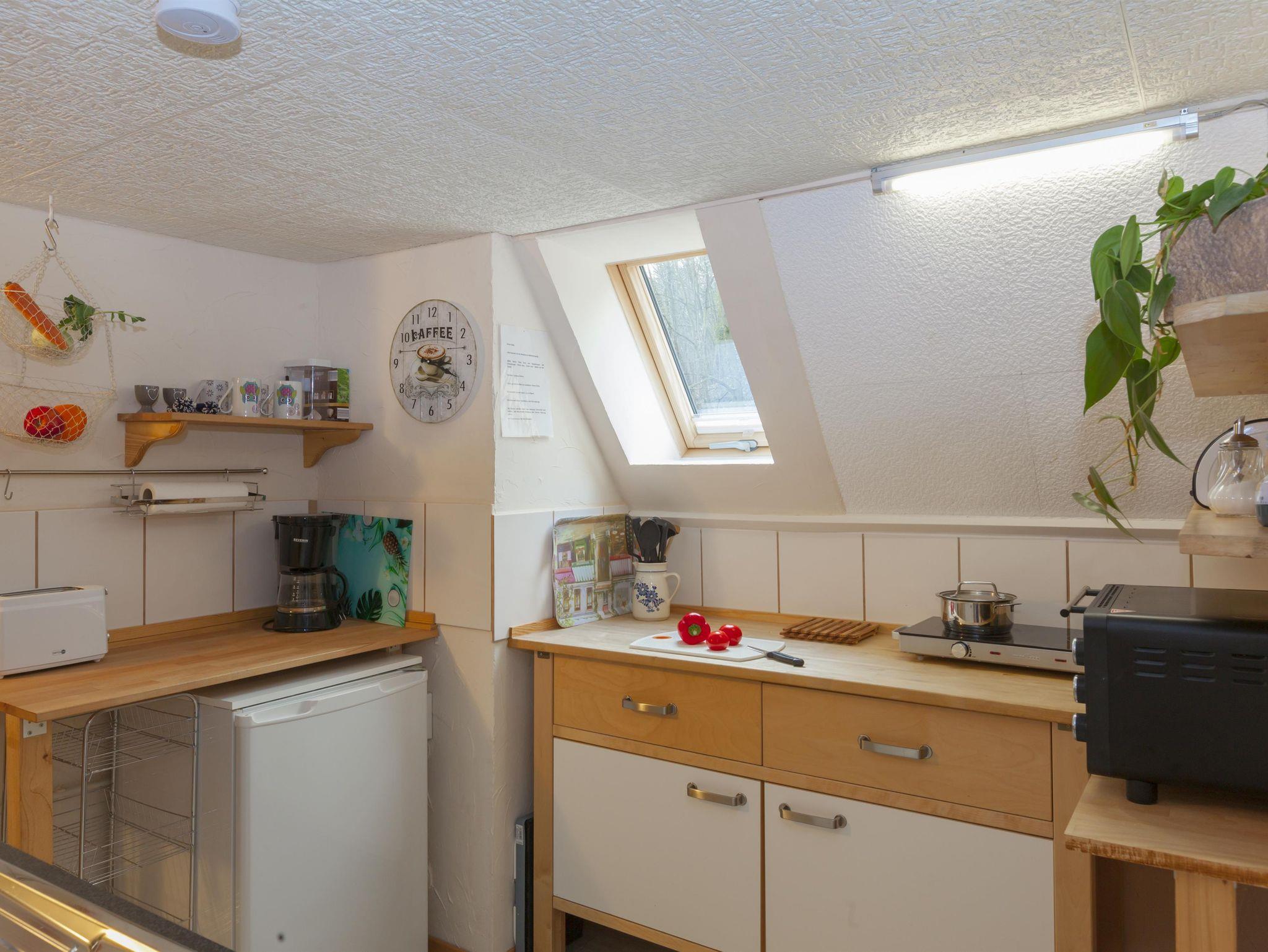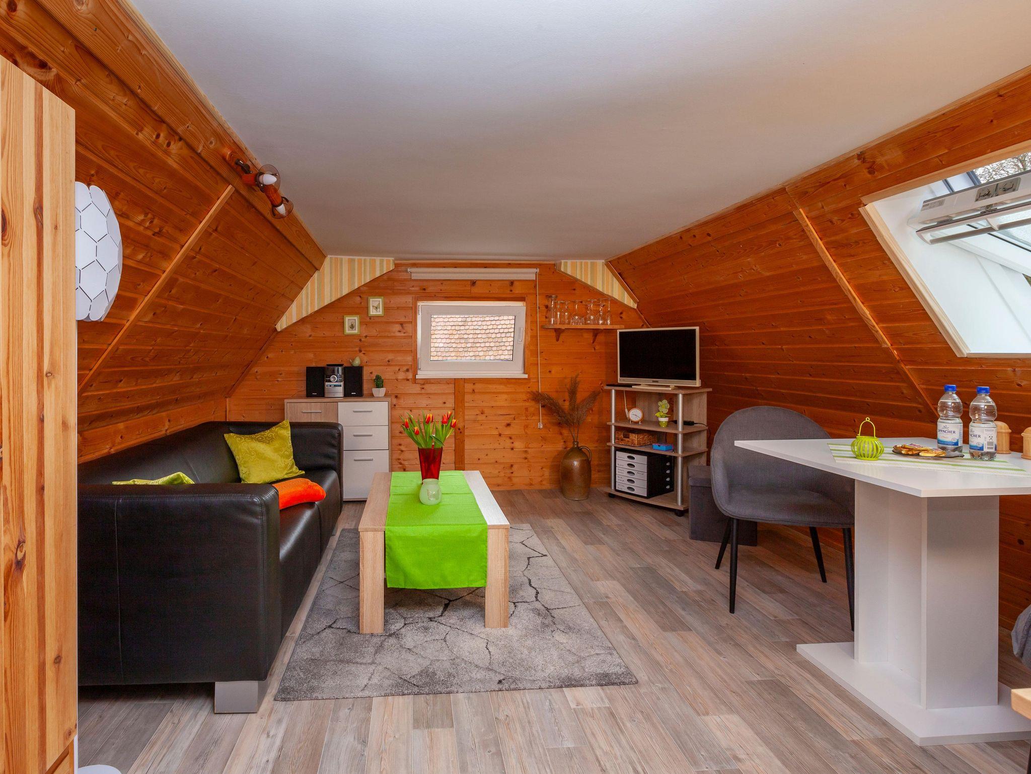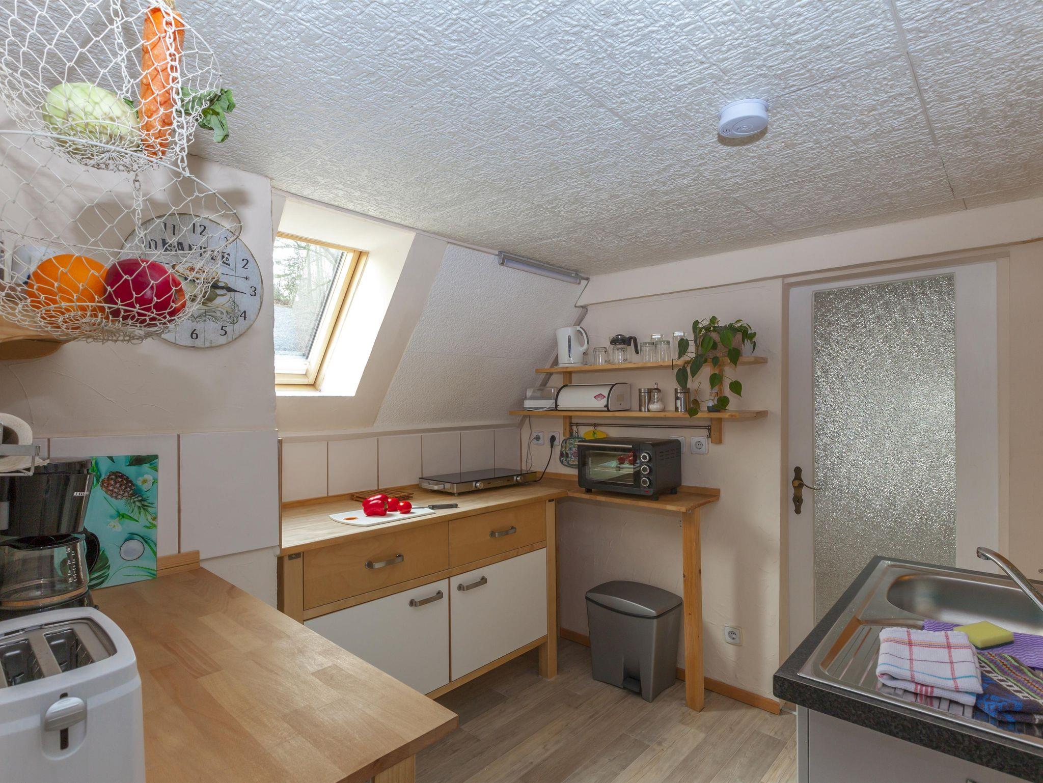 Die Nichtraucher-Ferienwohnung hat eine Größe von 45 m², liegt im Dachgeschoss und ist für 2 Personen geeignet. Sie verfügt über einen Wohnraum mit Couch, Essplatz, eingebautem Kleiderschrank, CD-MP3-Radio und Sat- TV. Die Küchenecke ist mit einem 2 Platten Ceran Kocher, Minibackofen, Kühlschrank mit Gefrierfach, Wasserkocher und Toaster ausgestattet. Das Schlafzimmer verfügt über ein Doppelbett (160 cm x 200 cm, geteilte Matratzen) und einen Wäscheschrank. Das kleine Bad ist mit einem WC und einer Badewanne mit integrierter Dusche ausgestattet.
