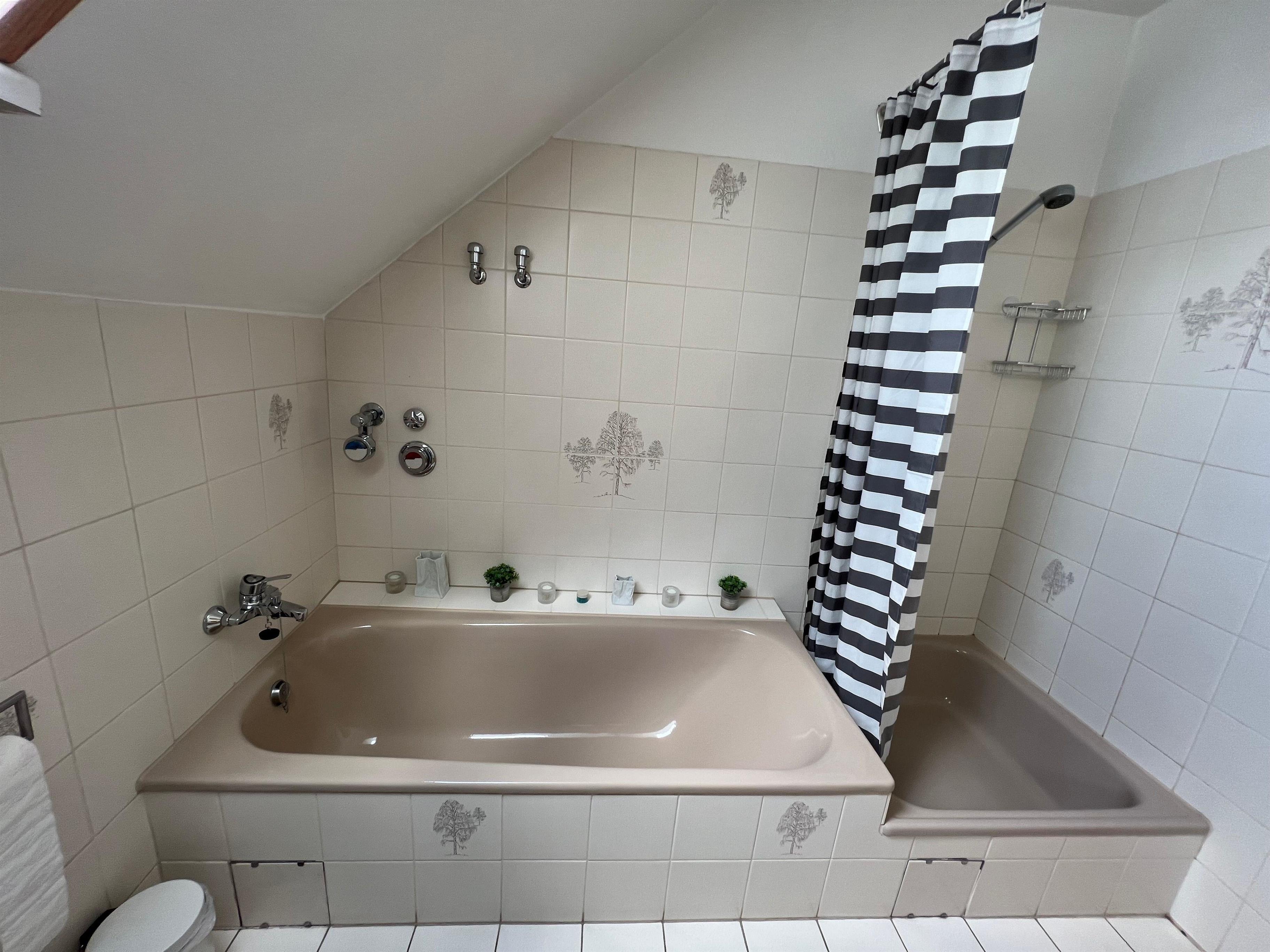 Duschbad und separater Badewanne, einem Wohnzimmer mit Eßtischgruppe, Ledergarnitur,