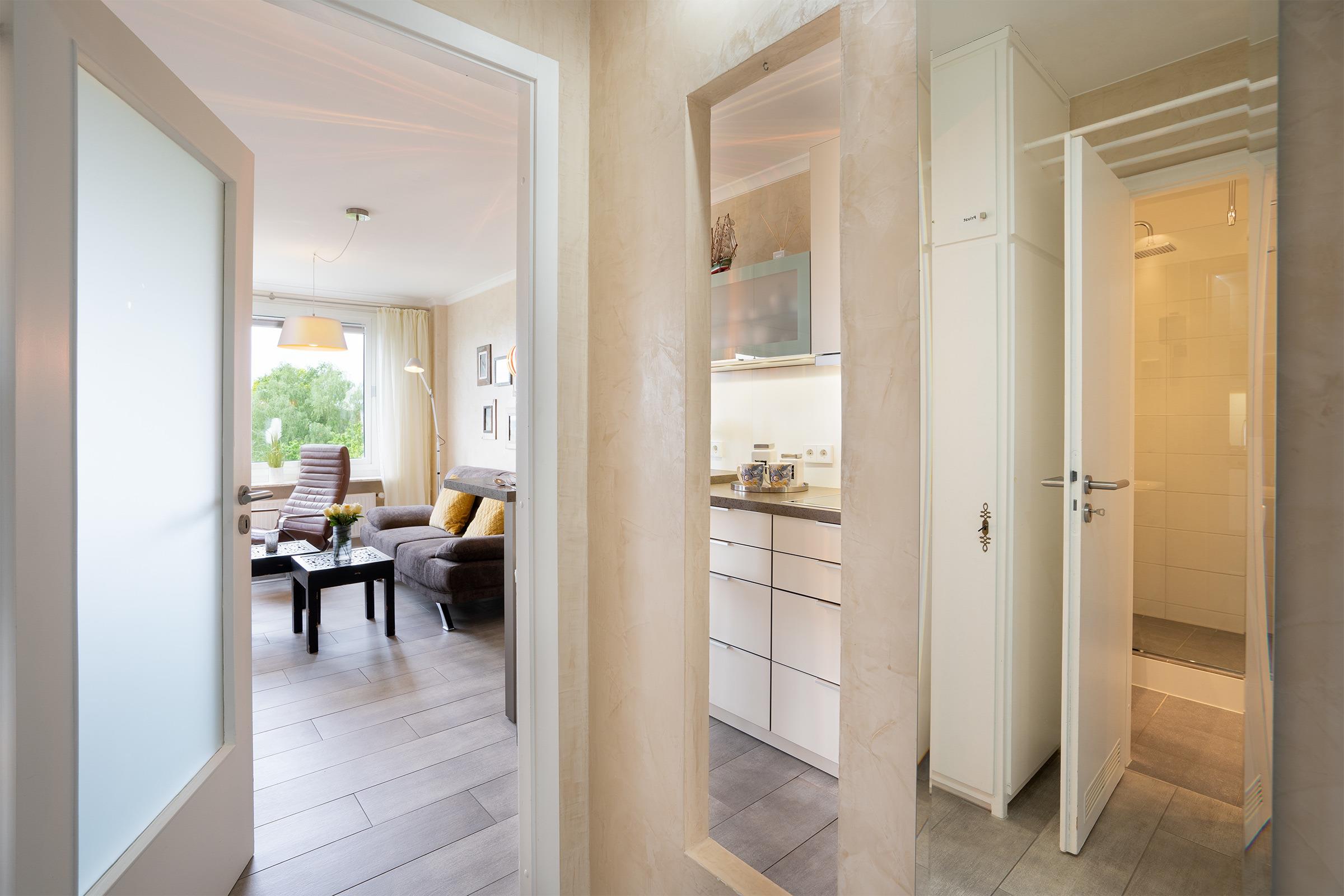 Das Quartier befindet sich im 5. Stock eines Apartmenthauses in der Ölmühlenallee direkt am Großen Plöner See. Es besteht aus einem Wohn-/Schlafzimmer mit großen Panoramafenstern, einer komplett ausgestatteten hochwertigen Küchenzeile mit Essplatz sowie einem modern sanierten Badezimmer mit Dusche und WC. Ein eigener Balkon bietet einen herrlichen Blick auf den See.