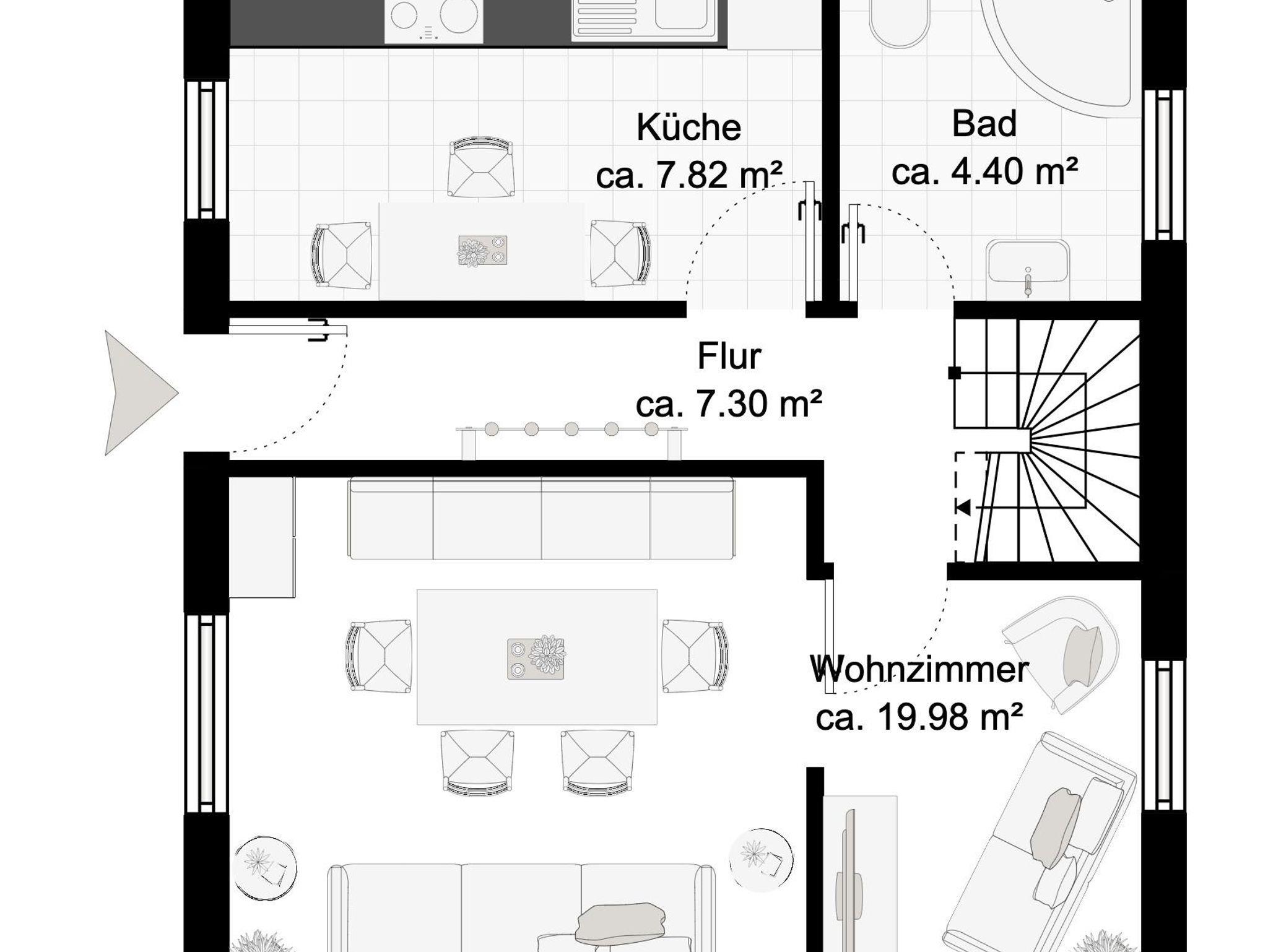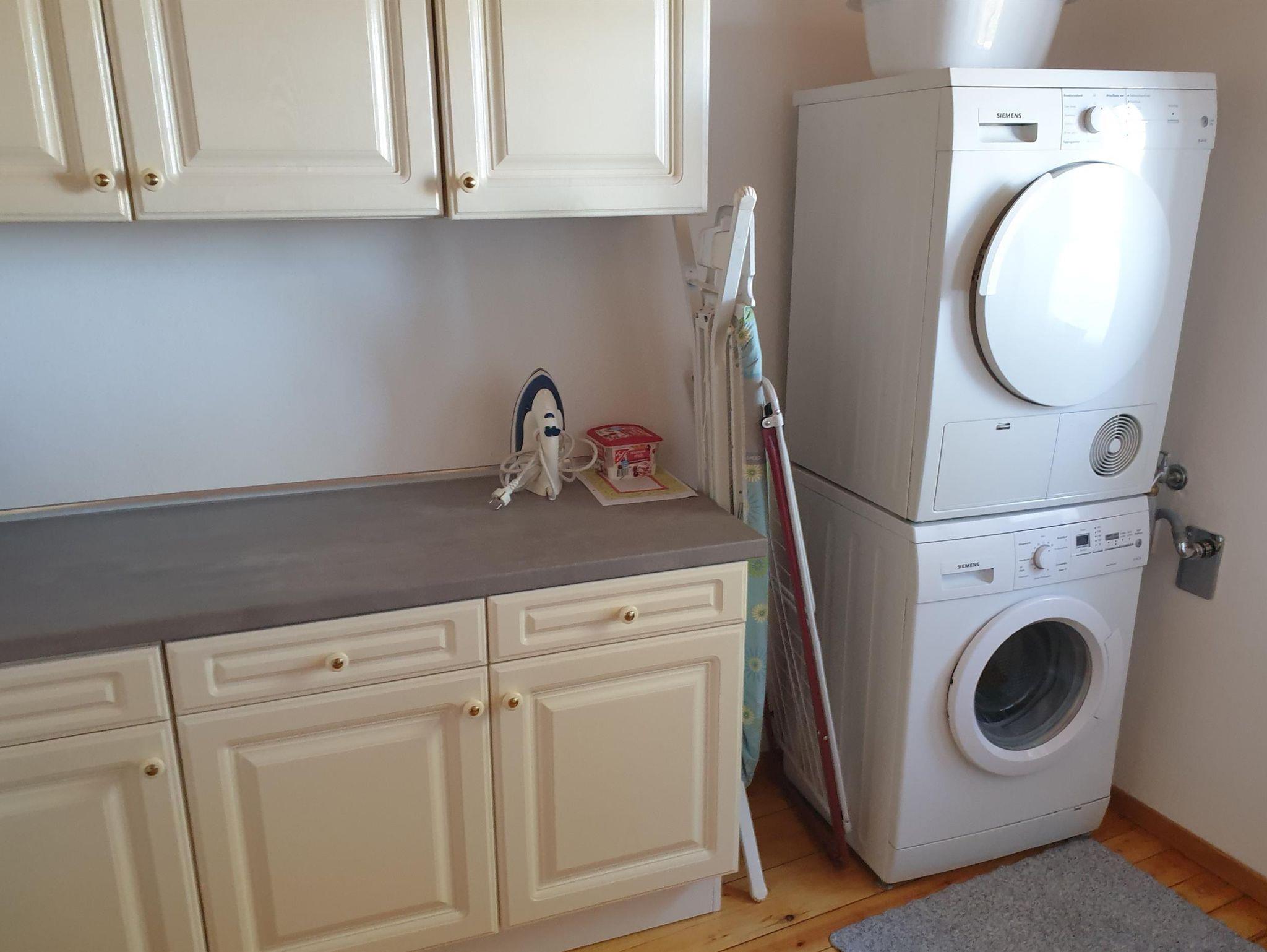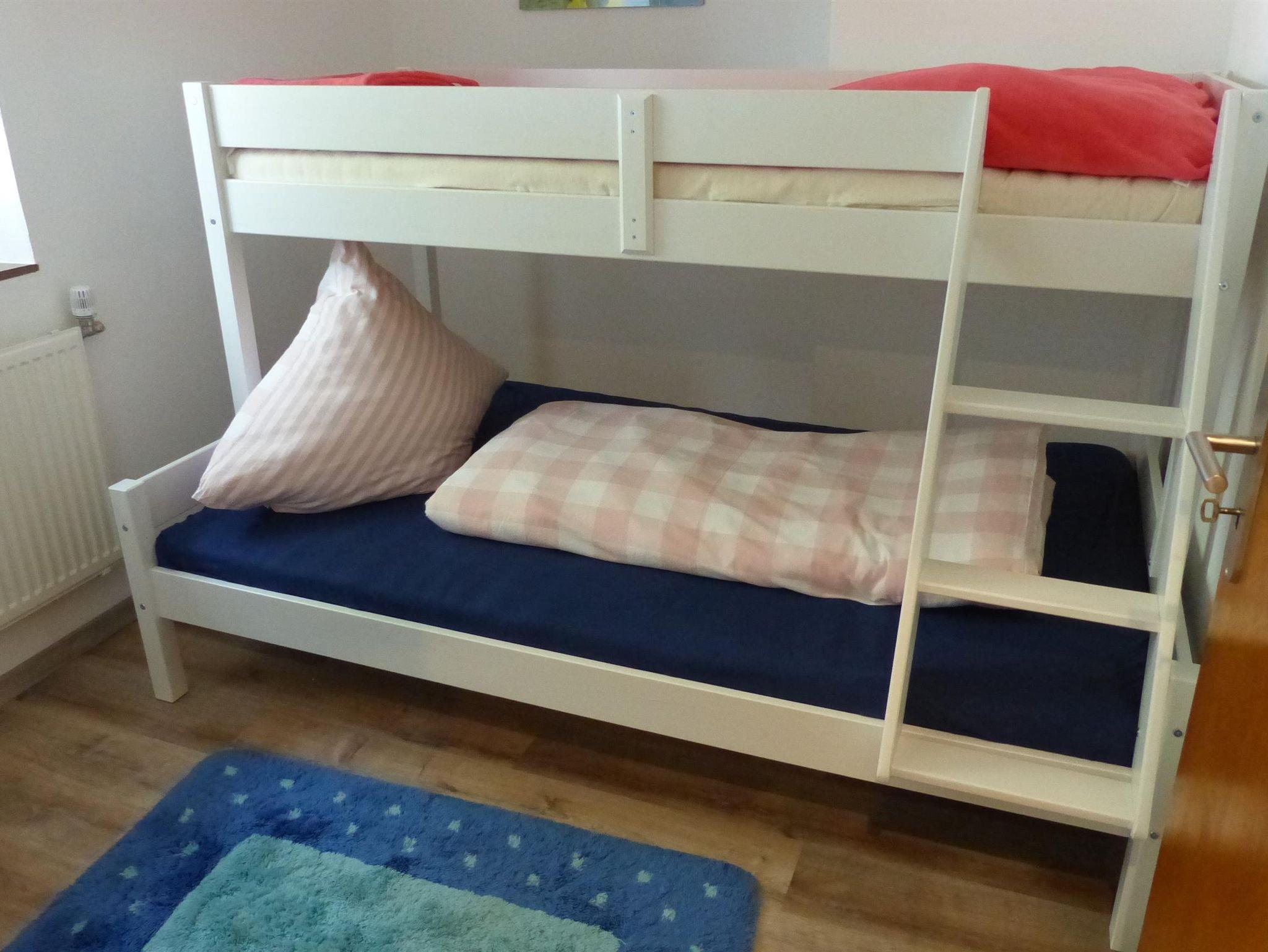 Auf 2 Etagen verteilen sich im Erdgeschoss die Küche mit Essplatz, ein Wohn-/Esszimmer und das Badezimmer. im 1. Obergeschoss befinden sich die drei Schlafzimmer, davon eines mit Etagenbett und 2 mit Doppelbett sowie ein Raum mit zusätzlichdem WC und Waschbecken sowie Trockner und Waschmaschine.