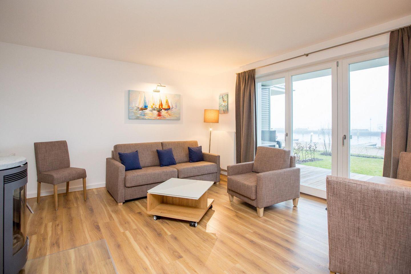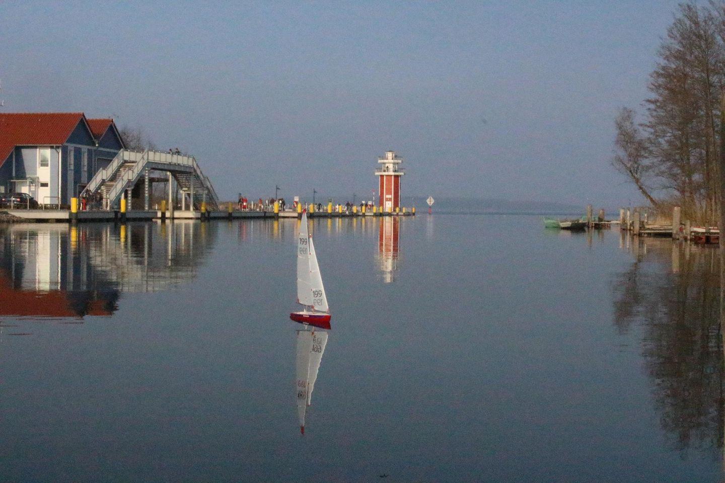 Der direkte Blick auf den Hafen und den dahinter liegenden See vermittelt ein maritimes Flair.