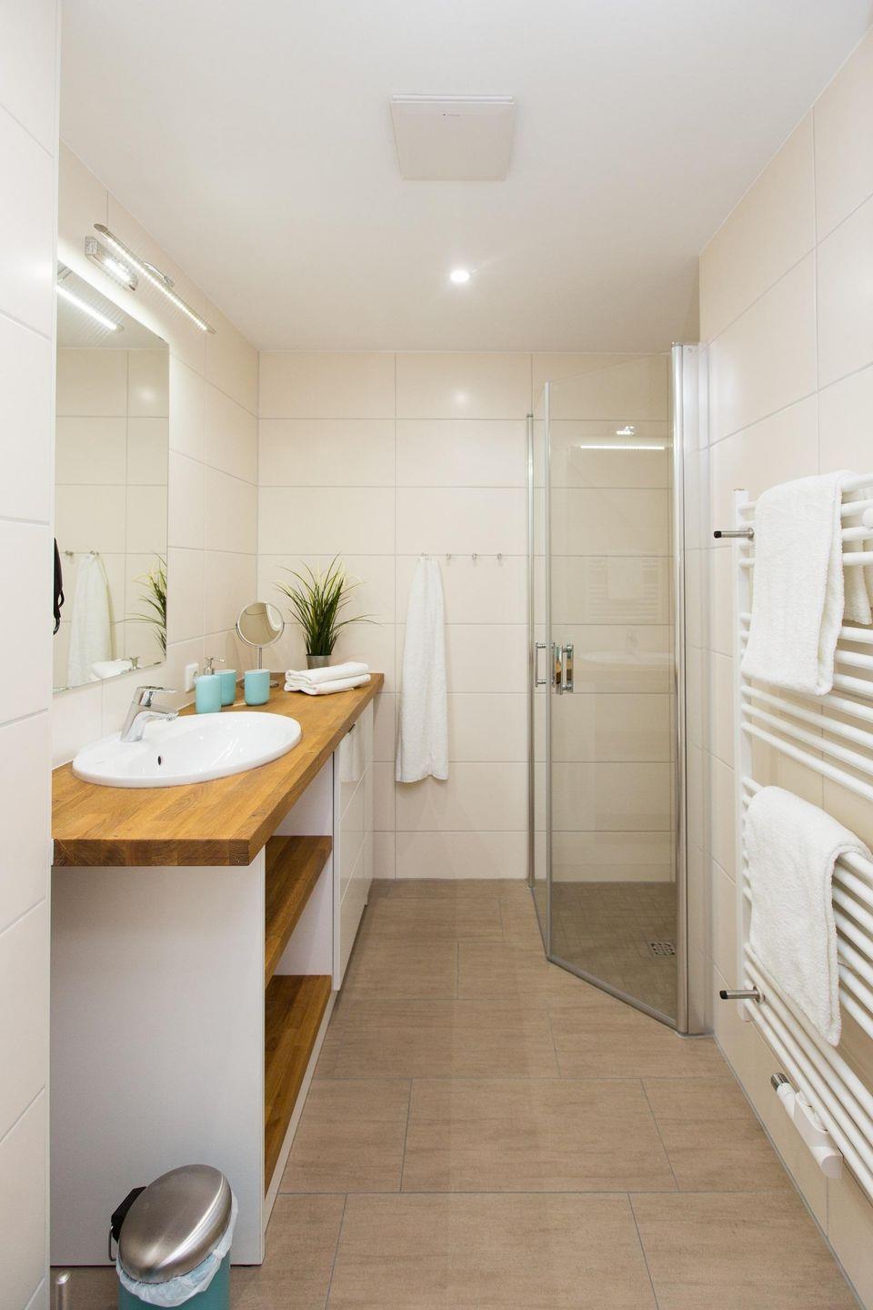 ein separates Schlafzimmer und ein Duschbad auf. Das Badezimmer ist mit einer Waschmaschine