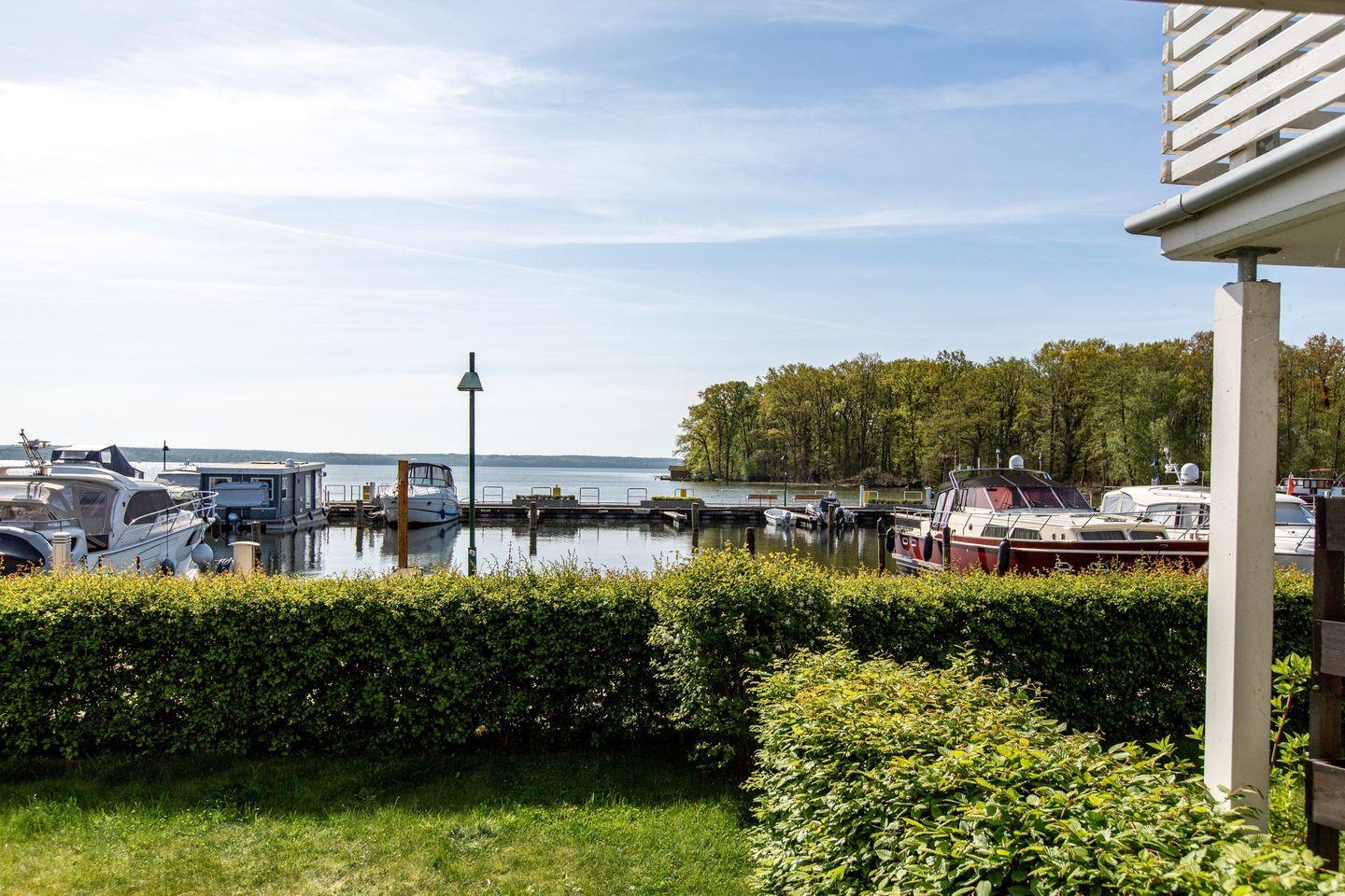 Der direkte Blick auf den Hafen und den dahinter liegenden See vermittelt ein maritimes Flair.