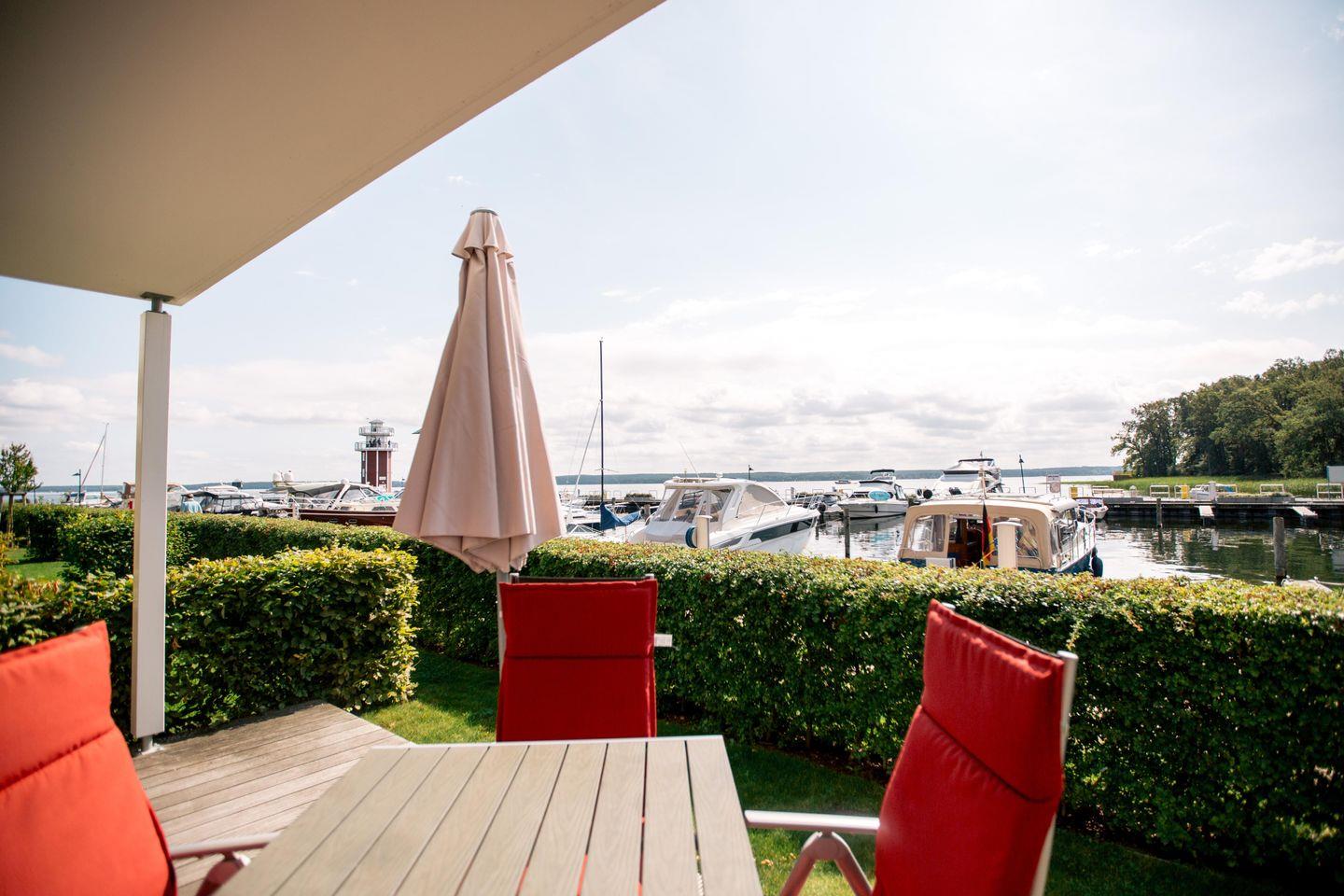 traumhafte Aussicht auf den neuen Hafen, Aussichtsturm und den Plauer See.