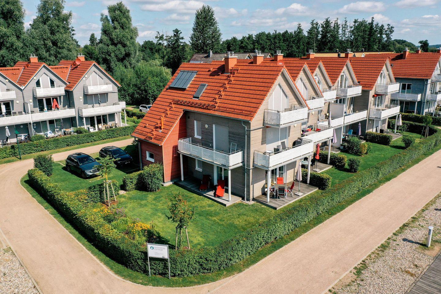 Im neuen Hafendorf Plau am See. Der eigene Parkplatz liegt direkt am Apartment.