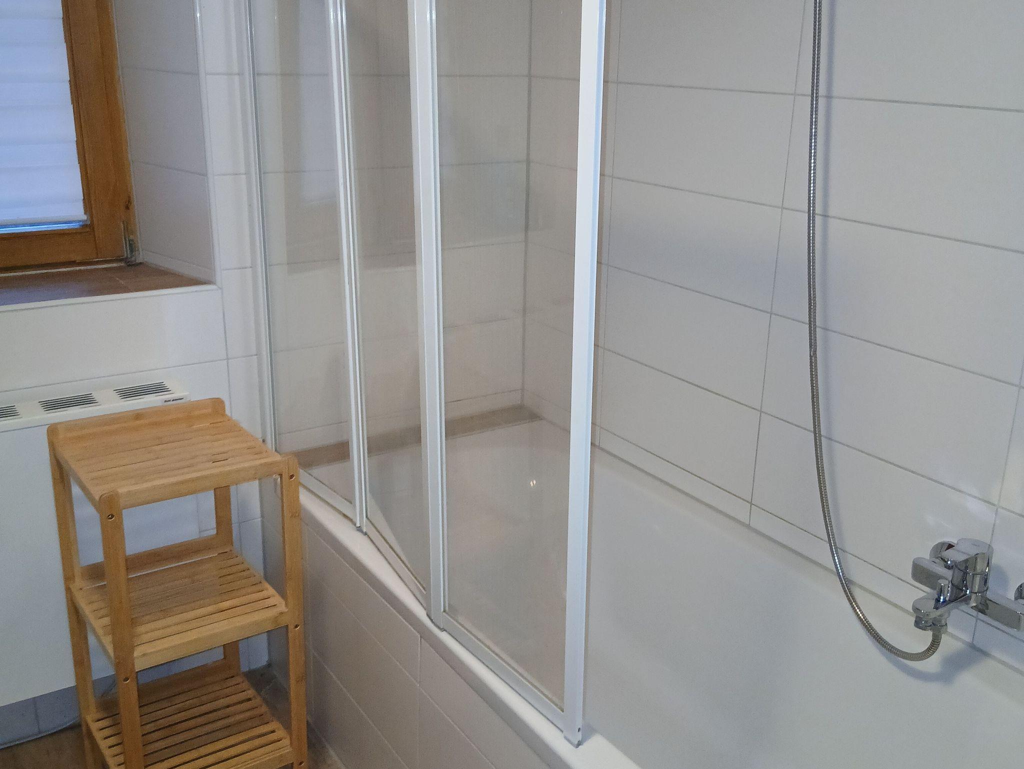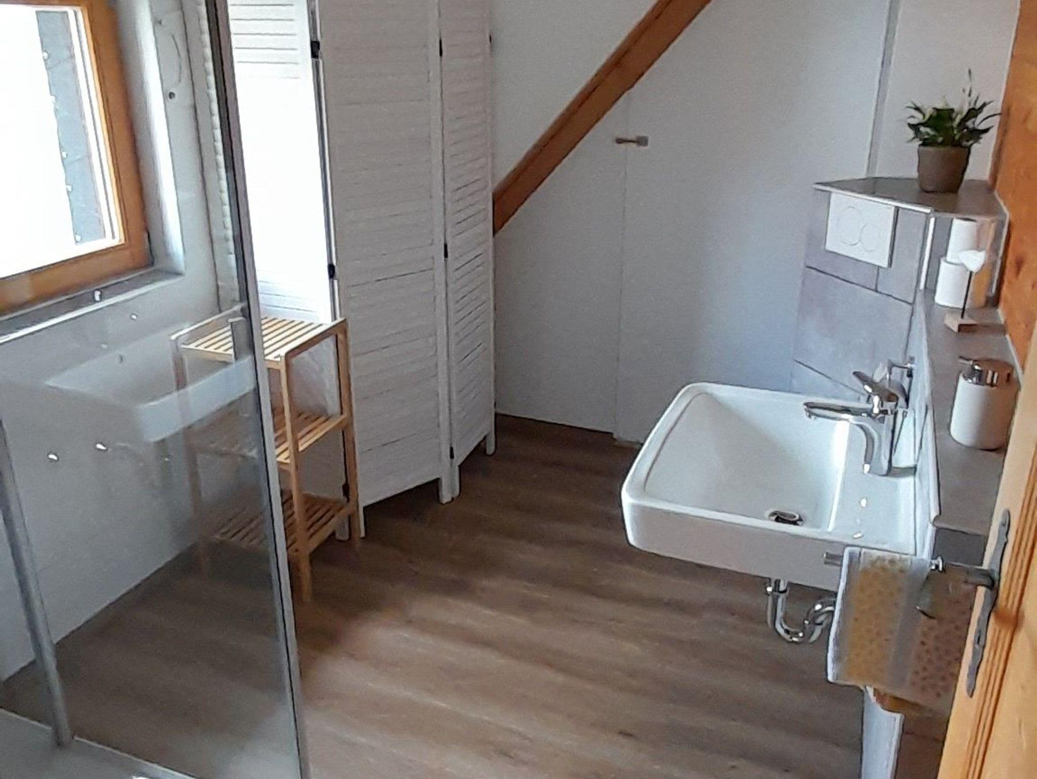 Das Bad verfügt über eine Badewanne mit Duschabtrennung, Waschbecken, WC, Waschmaschine und Fußbodenheizung. Im 1. Stock gibt es noch ein separates Gäste-WC mit Dusche.