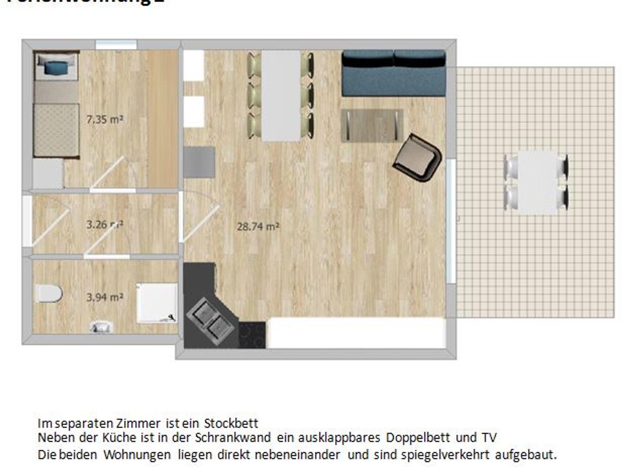 Die Wohnung ist 42qm groß und für bis zu 4 Personen geeignet. Die Wohnung verfügt über ein Schlafzimmer mit Etagenbett. Im Wohnbereich ist eine Couchecke (Schlafsofa für evtl. 5. Person) mit SAT-TV, ein Doppelbett, der Essbereich mit Küche (Herd, Spülmaschine, Mikrowelle). Das Bad ist mit Dusche und WC ausgestattet. Handtücher und Bettwäsche sind im Preis inklusive. Die Betten sind bei Anreise bezogen. Die Handtücher liegen für Sie bereit. Die Wohnung verfügt ausschließlich über Wischböden. Ein Babybett und Hochstuhl sind auf Anfrage vorhanden. Die Terrasse, ausgestattet mit Gartenmöbeln, ist nach Süd-Westen ausgerichtet. Auf der Terrasse können Sie gemütliche Grillabende verbringen. Ein Parkplatz ist im Preis inklusive. Die Wohnung ist perfekt für Radfahrer, die den Brombachsee erkunden möchten.