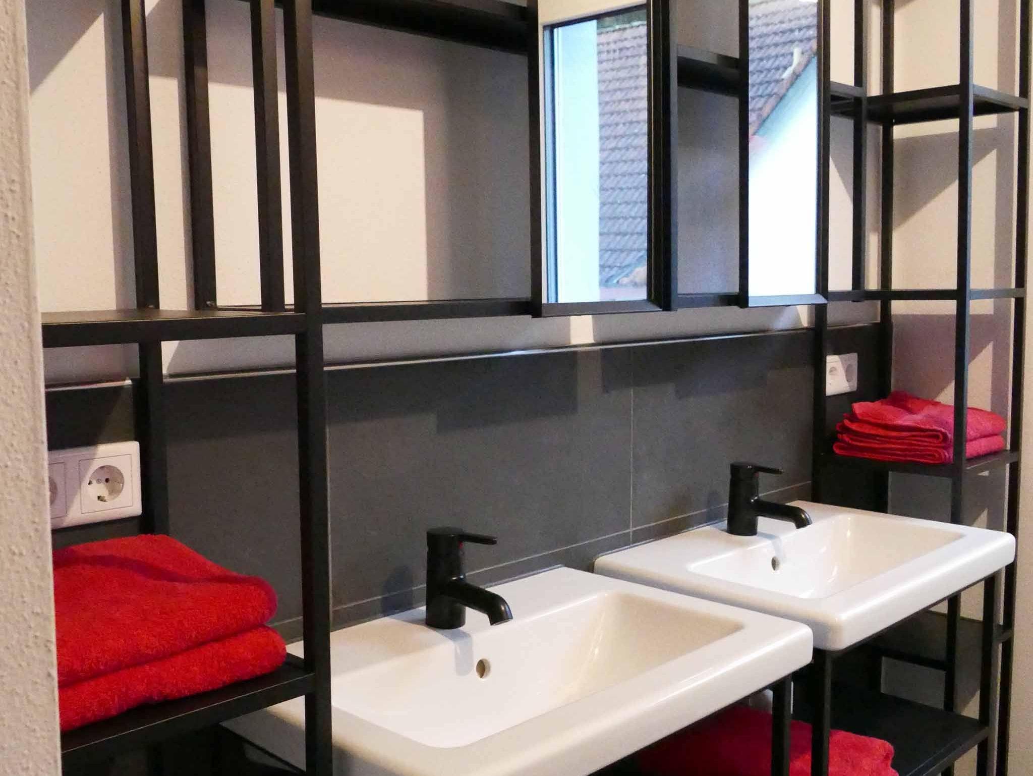 Die Tageslichtbäder sind mit Doppelwaschbecken, Dusche und WC ausgestattet.
