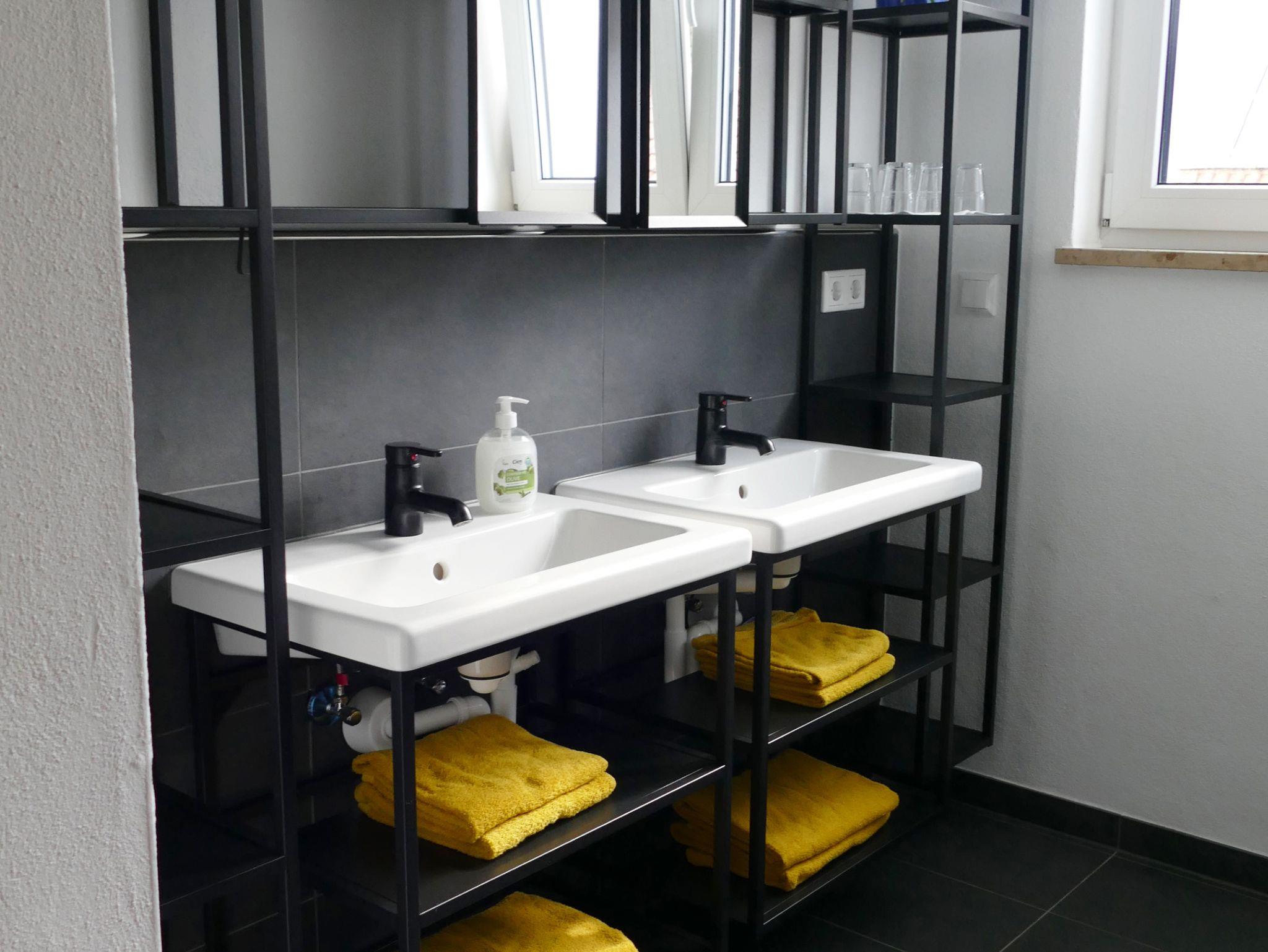 Die Tageslichtbäder sind mit Doppelwaschbecken, Dusche und WC ausgestattet.