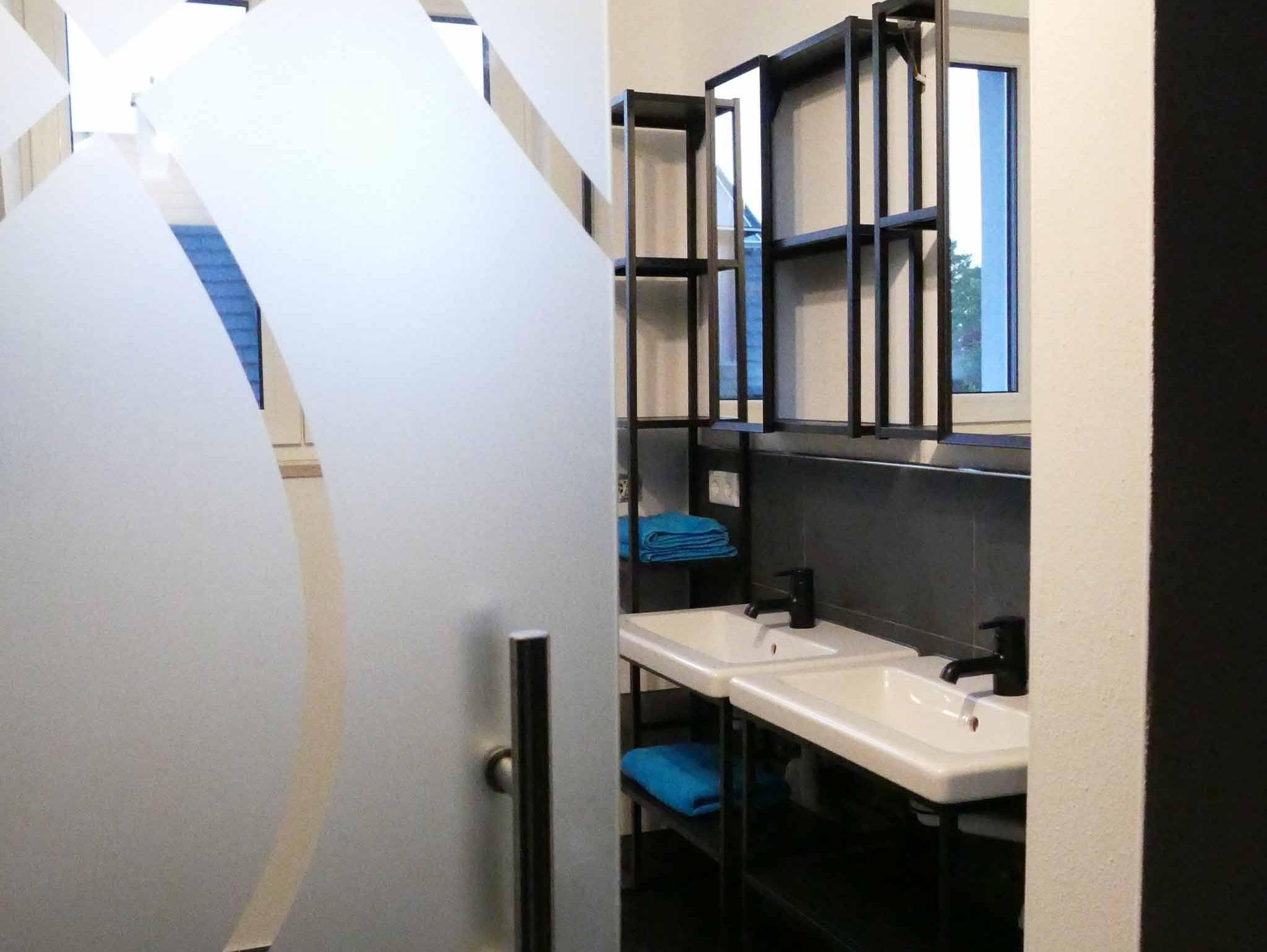 Die Tageslichtbäder sind mit Doppelwaschbecken, Dusche und WC ausgestattet.