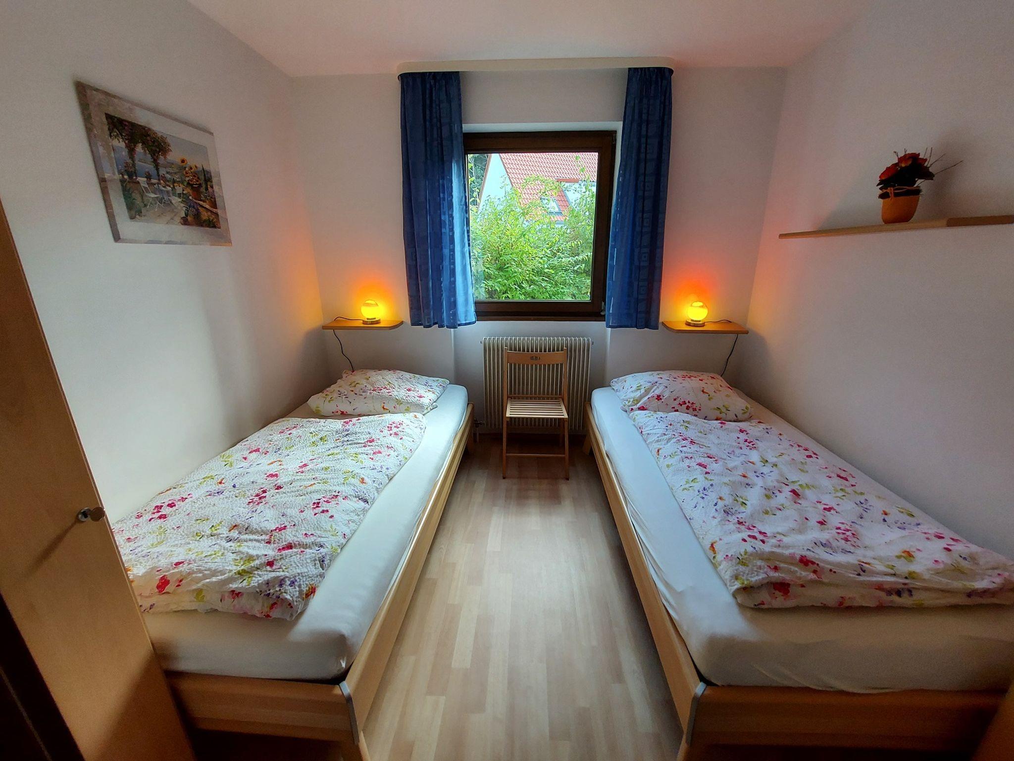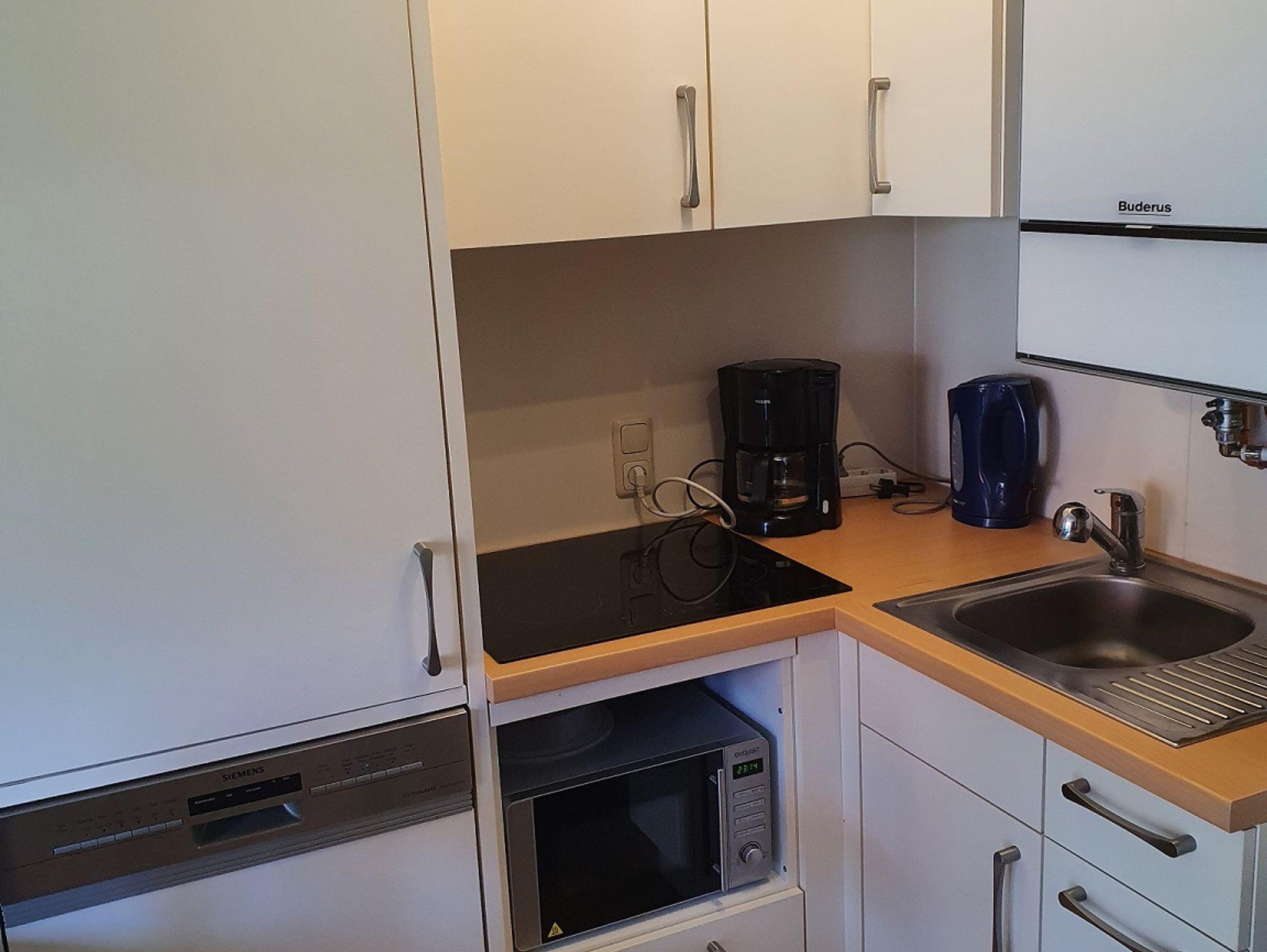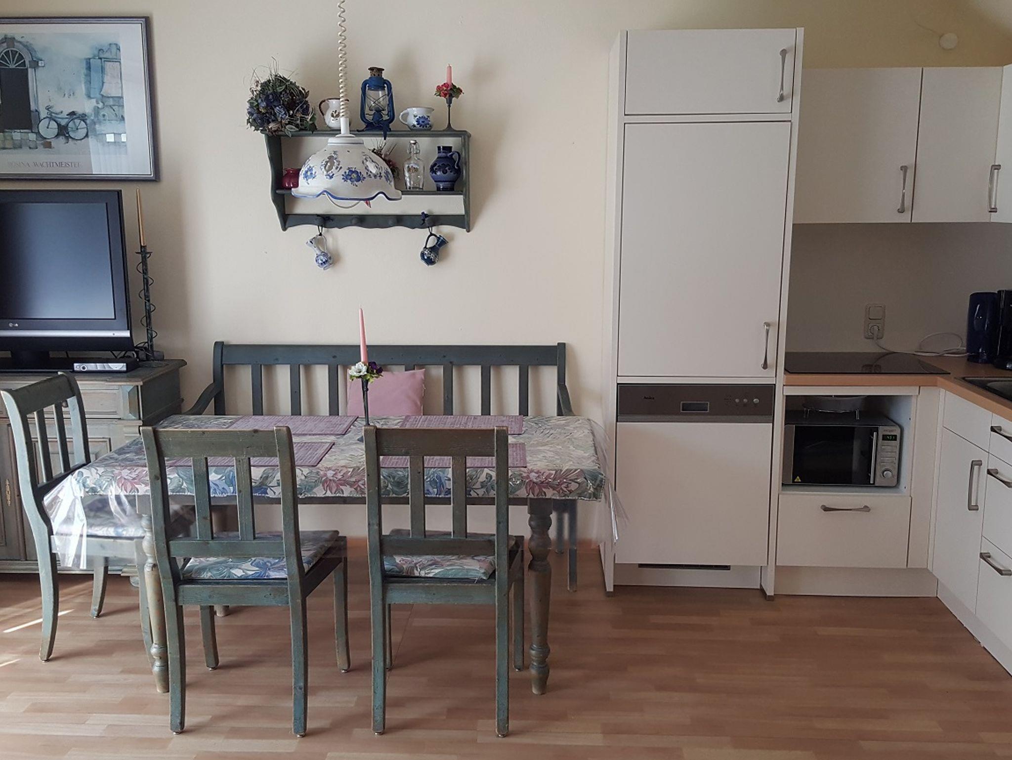 Die Ferienwohnung liegt im Erdgeschoss mit Terrasse und Garten. Die Wohnung besteht aus einem Zweibettzimmer sowie einem Wohnzimmer mit Essecke und Doppelschlafcouch. Des Weiteren befindet sich im Wohnzimmer eine Kochnische mit 4 Platten-Induktionsherd, Geschirrspüler, Kühlschrank und einer Mikrowelle mit Grill- und Umluftfunktion. Geschirr ist vorhanden. Das Bad verfügt über eine Duschkabine, ein Waschbecken und eine Toilette.