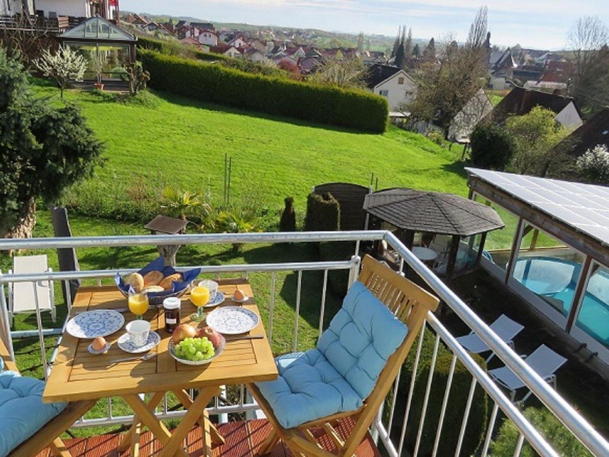 Ihr großer Balkon mit Ausblick auf Wald und Weinberge ist mit Gartenmöbel und Sonnenschirm bestückt.