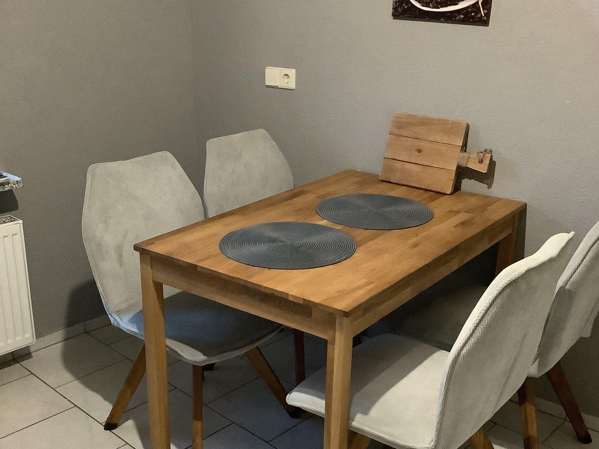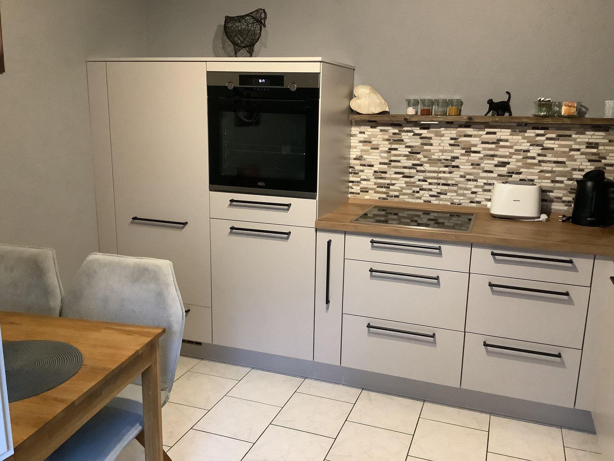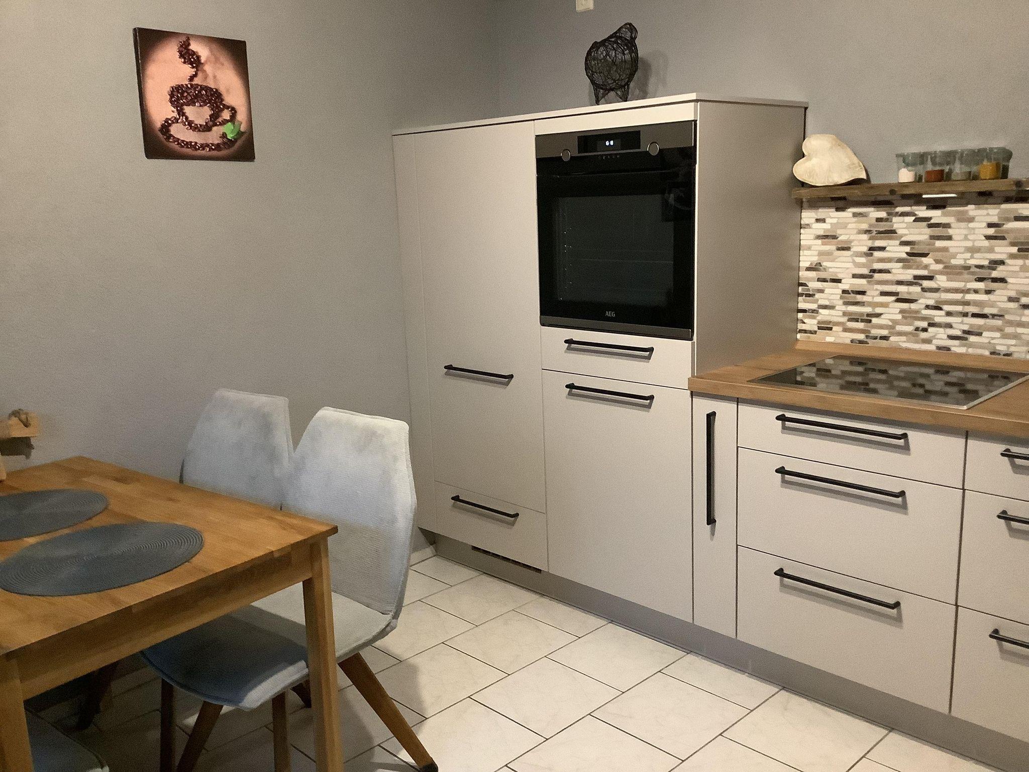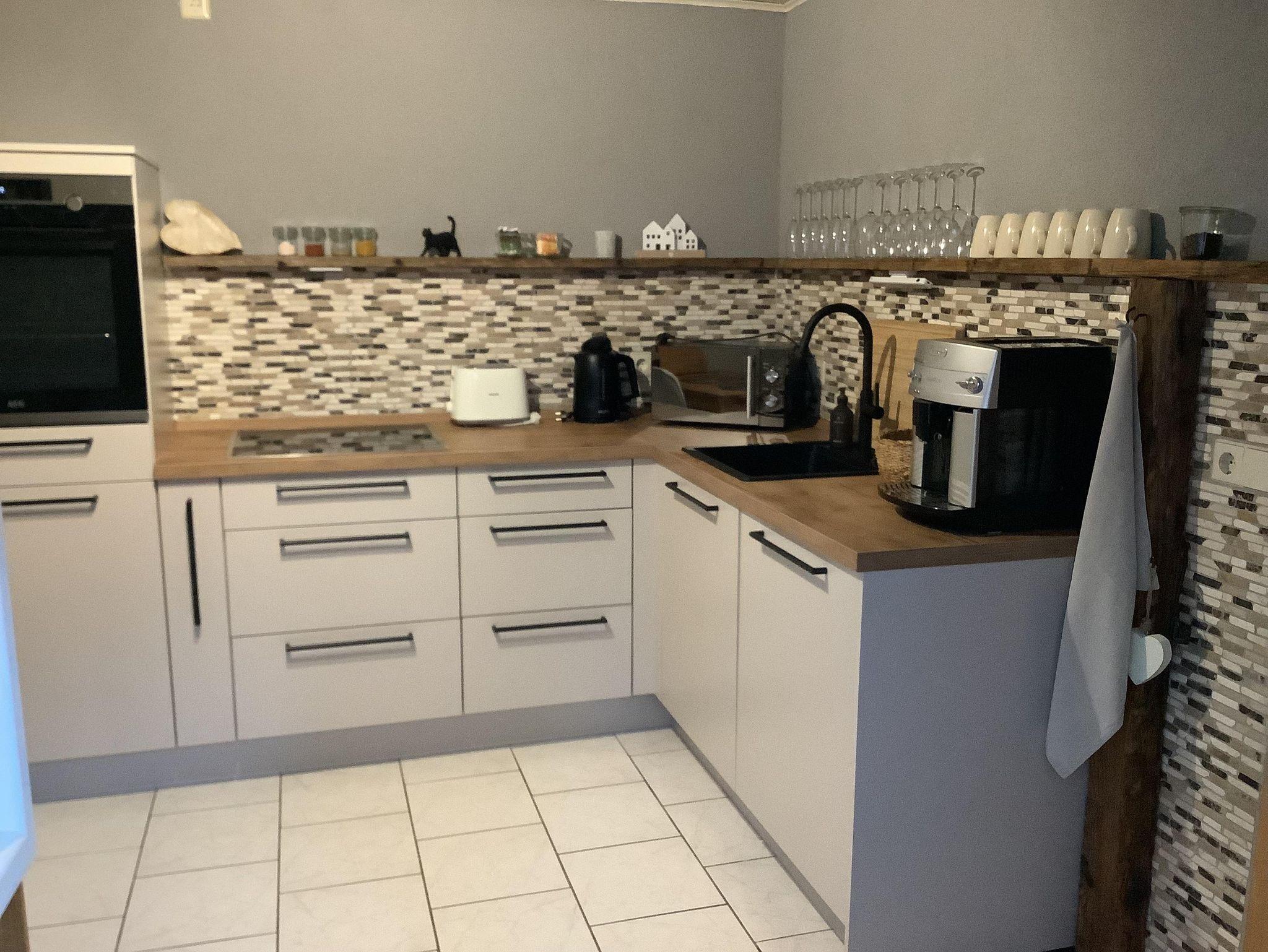 Unsere 65 qm große Ferienwohnung ist auf 2 Etagen . Unten befindet sich die Küche und das Badezimmer mit Dusche, oben Wohnzimmer und Schlafzimmer.