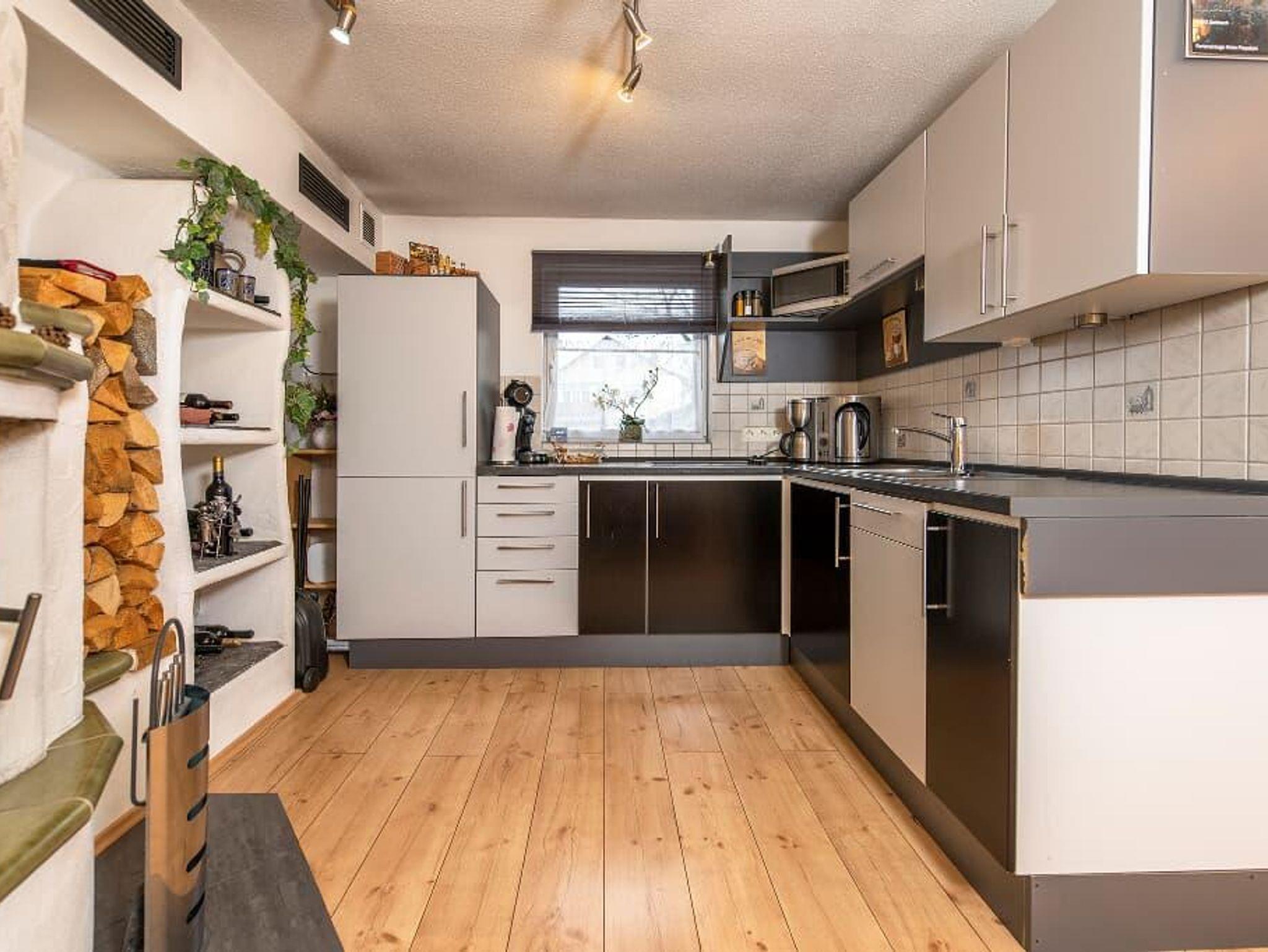 Im Wohn / Essraum mit L-Form Küche, ist eingebettet ein Kachelofen nebst natürlichen Weinregal mit edlen Weinen!