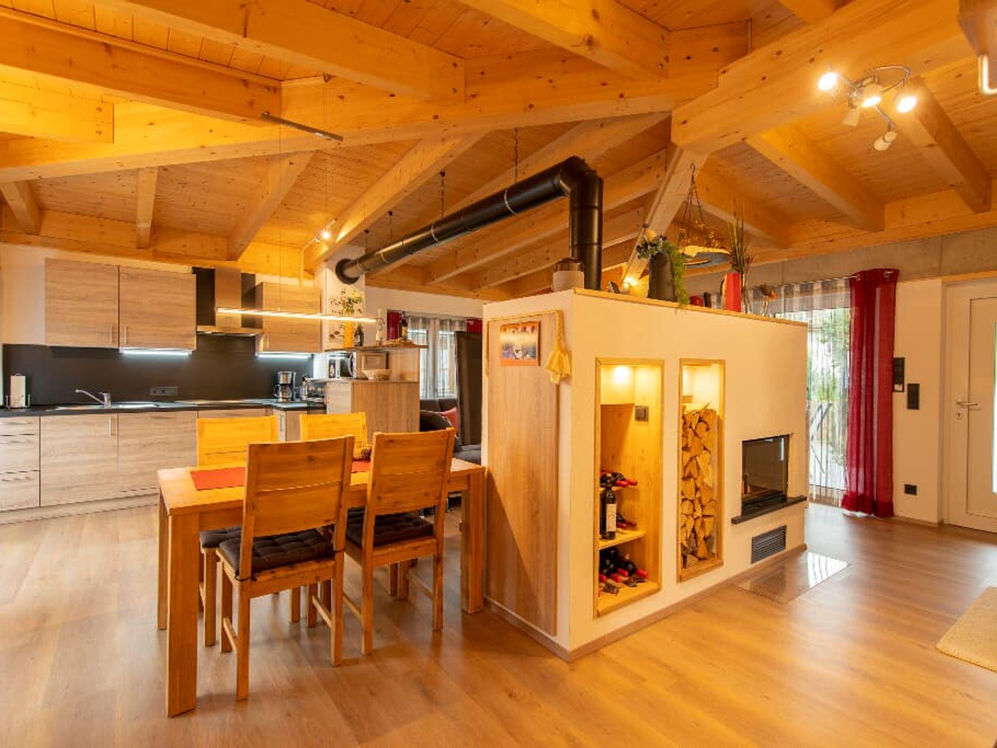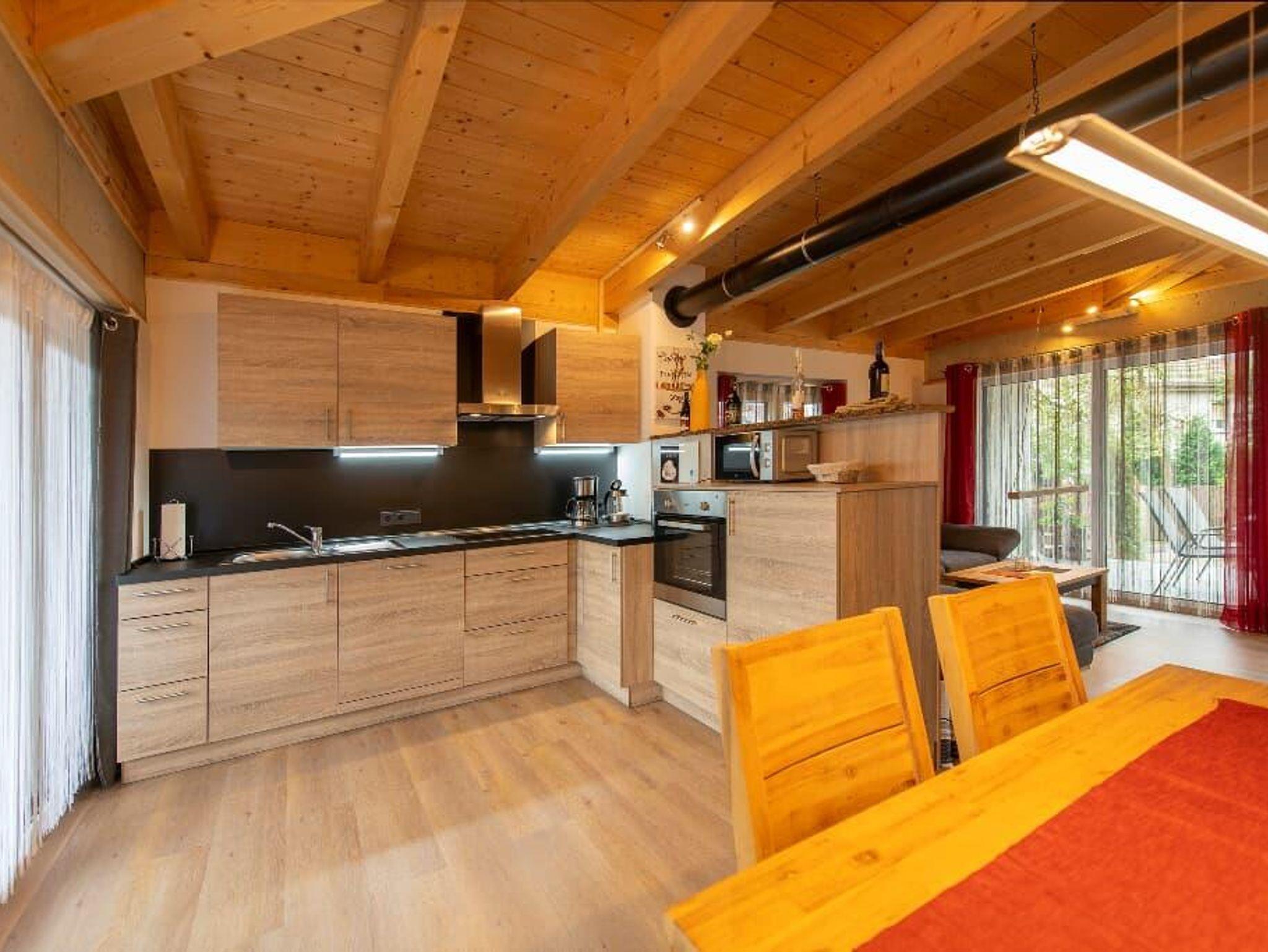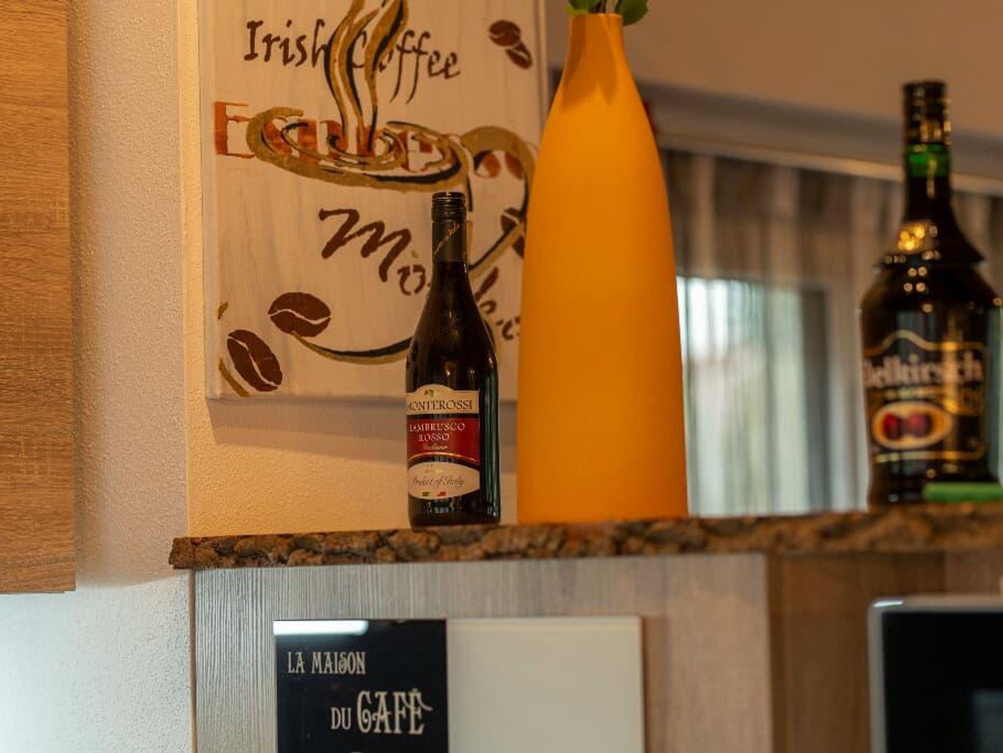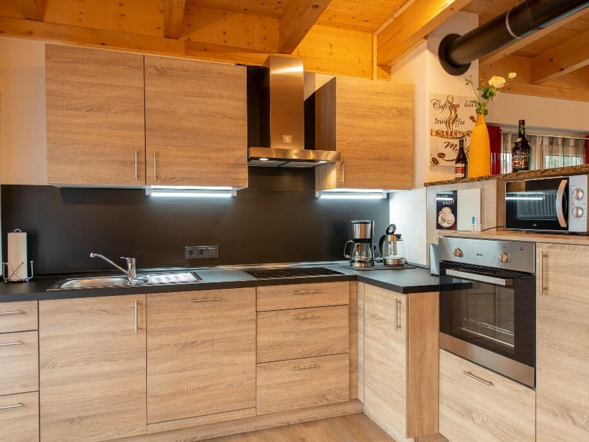 Der gemütliche Wohnbereich mit Kachelofen und „integrierten Weinregal“ mit edlen Weinen lassen so manchen Abend auf der Terrasse oder Balkon besinnlich ausklingen. Auch in der Küche wird es Ihnen an nichts fehlen, dafür sorgt am morgen ein Frühstückscenter mit Kaffeemaschine, Tee-Zubereiter und Doppeltoaster. Ein vierplatten-Cerankochfeld mit Backofen unterstützt Sie bei der Zubereitung Ihrer Speisen.