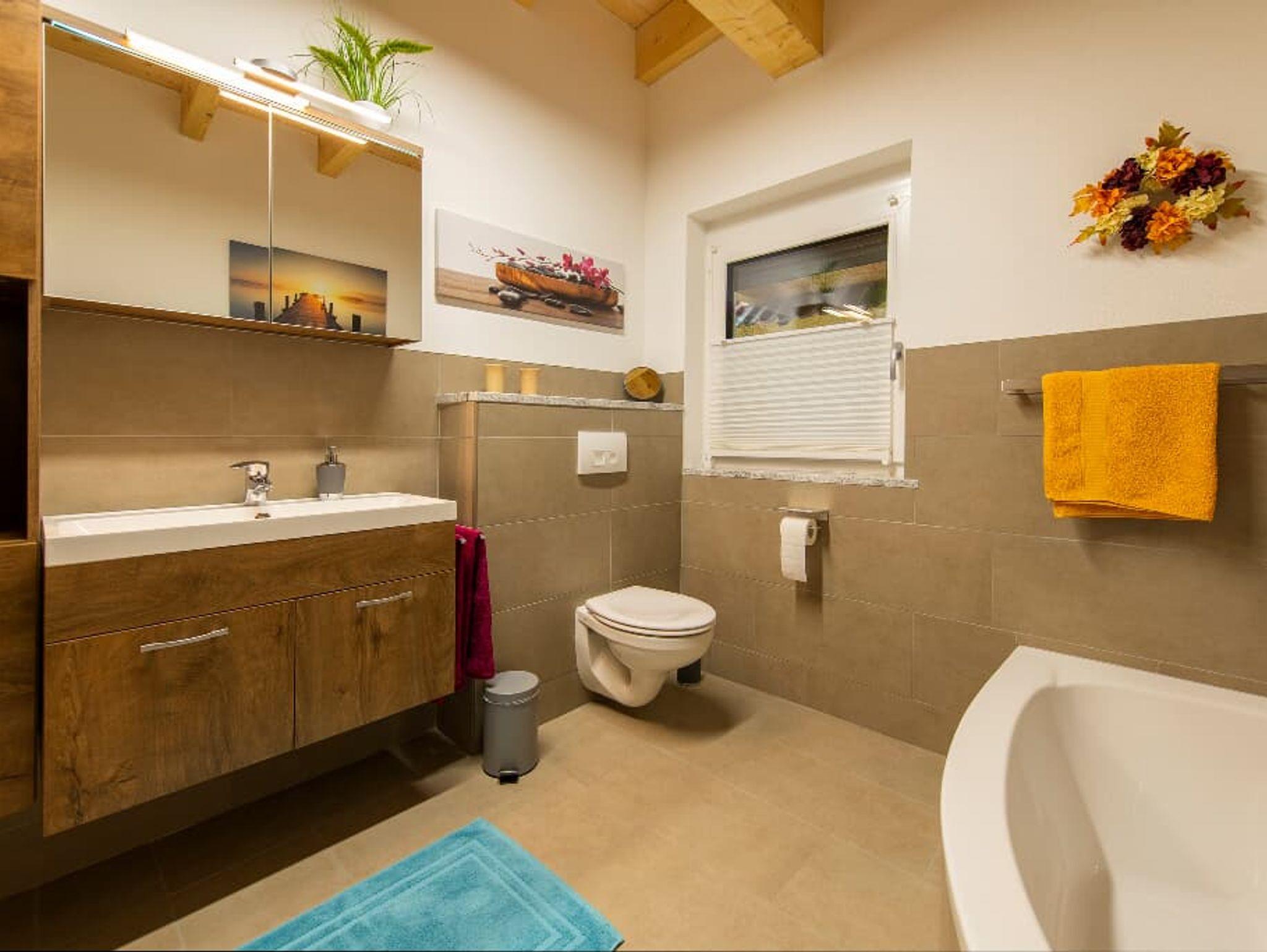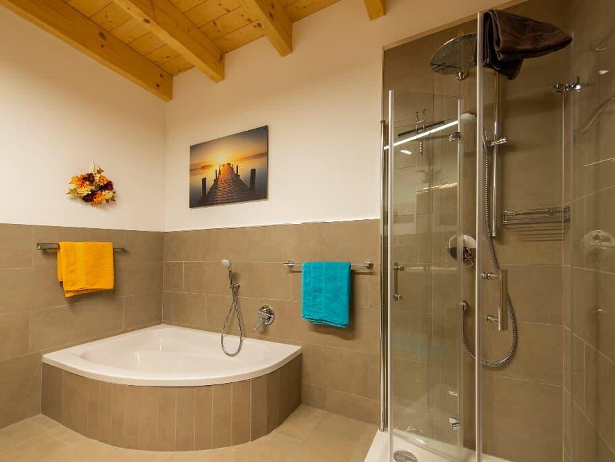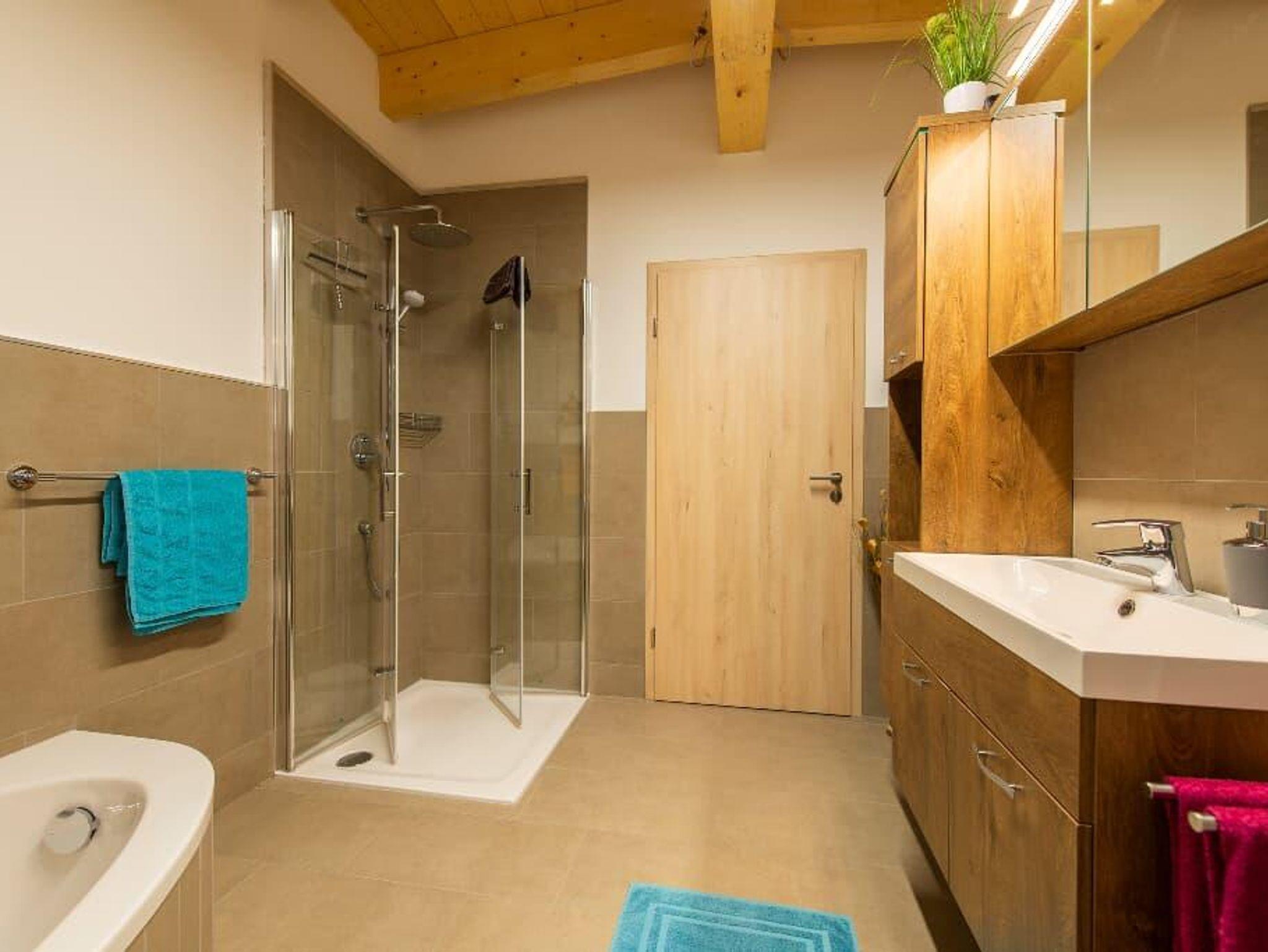 Eine wohltuende Erfrischung genießen Sie bei einem Shower in der begehbaren Dusche unter dem Panel, unterlegt mit Musik oder ein besinnliches Bad in der Badewanne, für gutes Aussehen der Fön…
