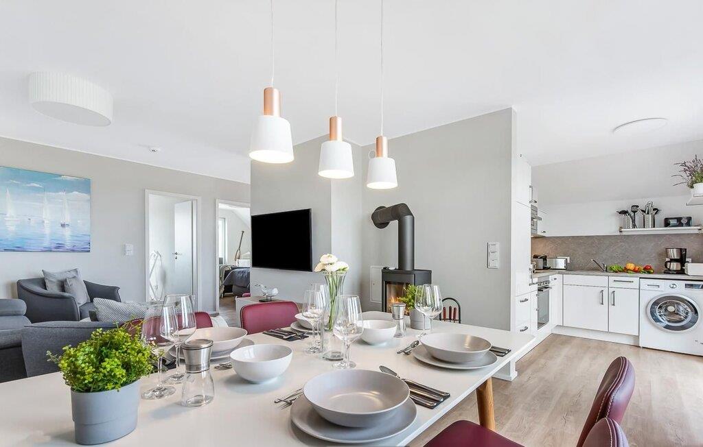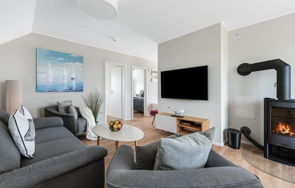 En hyggelig opholdsstue med pejs og smart-tv, der fører ind til køkkenet af høj kvalitet, udgør centrum af denne ferielejlighed. Og når solen skinner, åbner I dørene til den tilstødende altan og nyder jeres måltid udenfor på de komfortable og stilfulde udendørsmøbler. Der er også en Weber el-grill på altanen til sociale grillaftener.