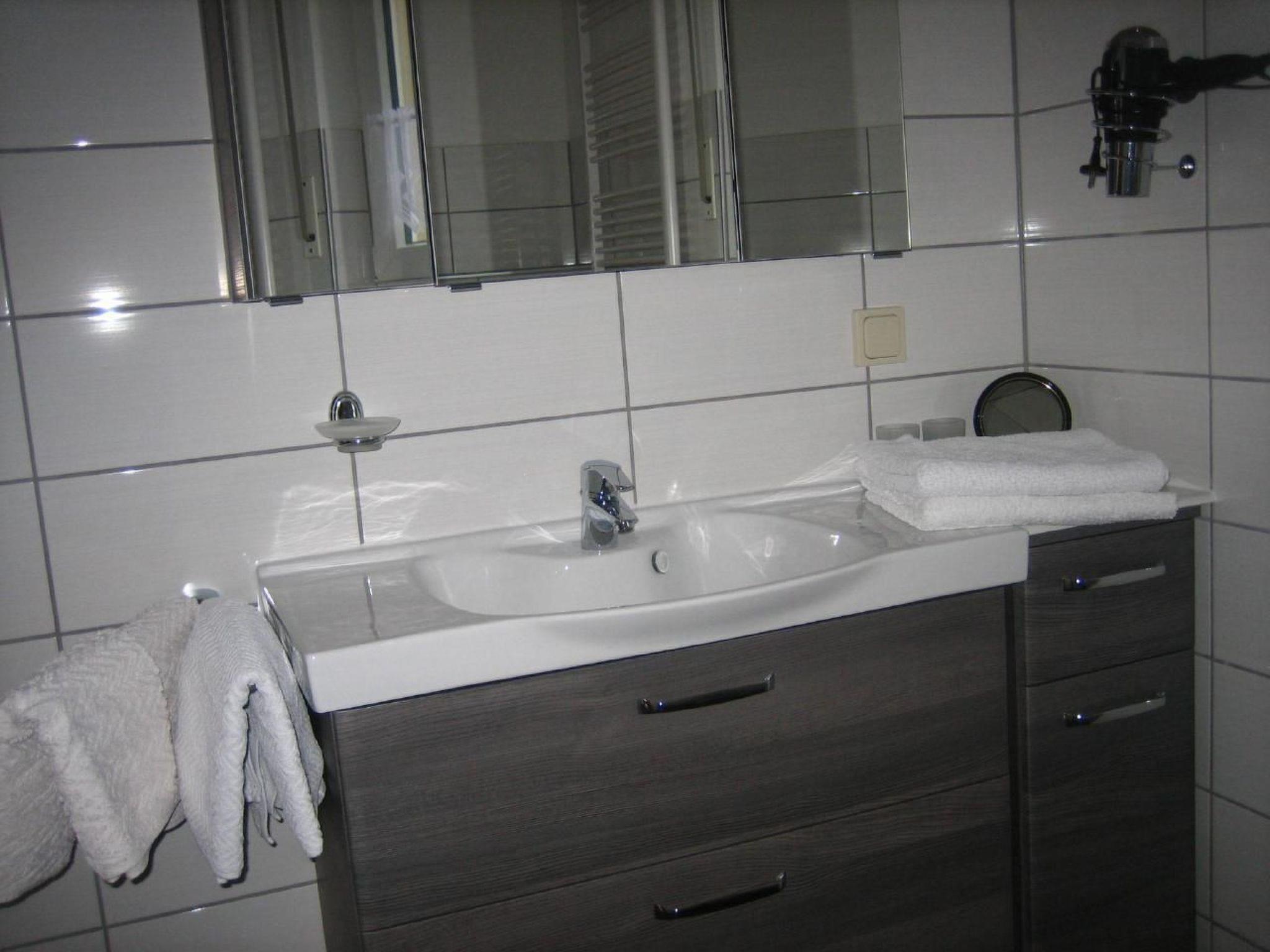 For your comfort, the interior of our flat is equipped with everything you need for a carefree stay. Relax in the living room in front of the flat-screen TV, enjoy your favourite music on our music system or sink into the reading corner, which is equipped with a selection of information material. The kitchen leaves nothing to be desired with its extensive equipment. The bathroom offers a walk-in shower and a spacious washbasin for your convenience. Sleep heavenly in our bedrooms - one with a 2 x 2 metre bed, the other with a single bed and a pull-out armchair with slatted frame.
