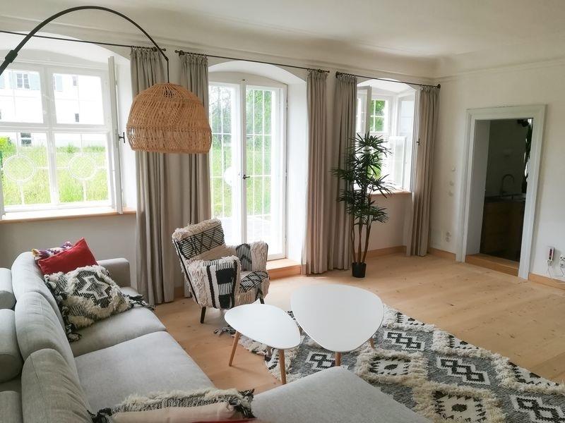 Das lichtdurchflutete Wohnzimmer besticht durch seine vielen historischen Kastenfenster, welche aufwendig restauriert wurden, um den geschichtsträchtigen Charakter des Hauses zu erhalten. Das großzügige Sofa und der schöne Blick in den umliegenden Garten sind beste Voraussetzungen dafür, entspannte Momente bei uns in Polling zu erleben. Ein zusätzliches Schlafsofa bietet neben dem Hauptschlafzimmer noch zwei weitere komfortable Schlafplätze.