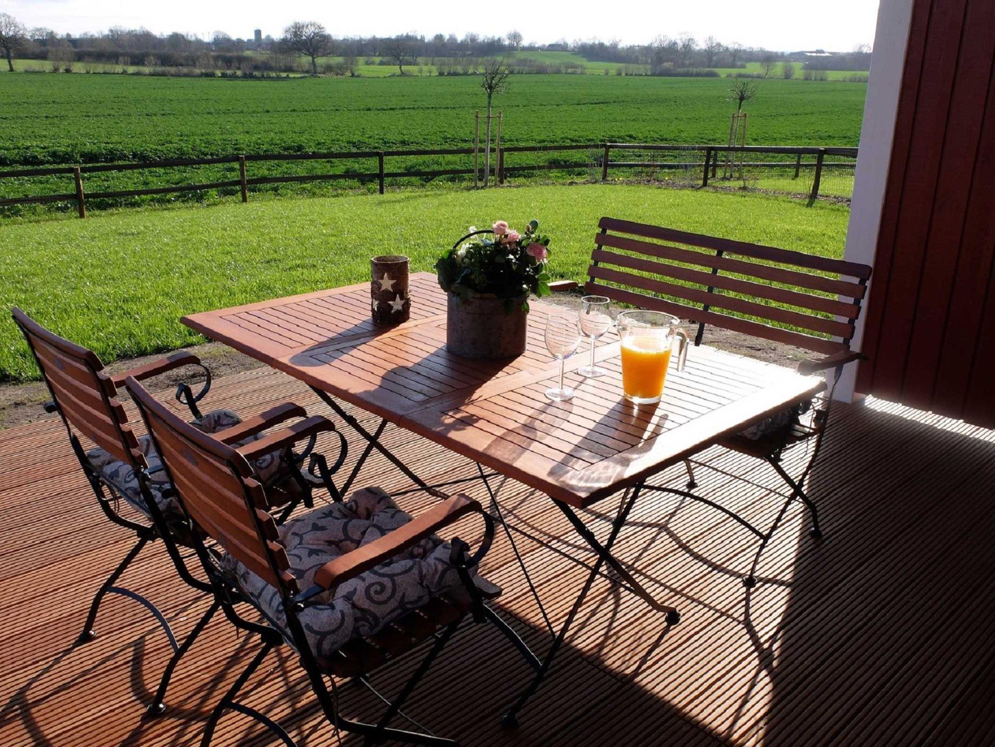 - teilweise überdachte Terrasse mit Sitzmöbeln, Sonnenliege und weitem Blick über Wiesen und Felder