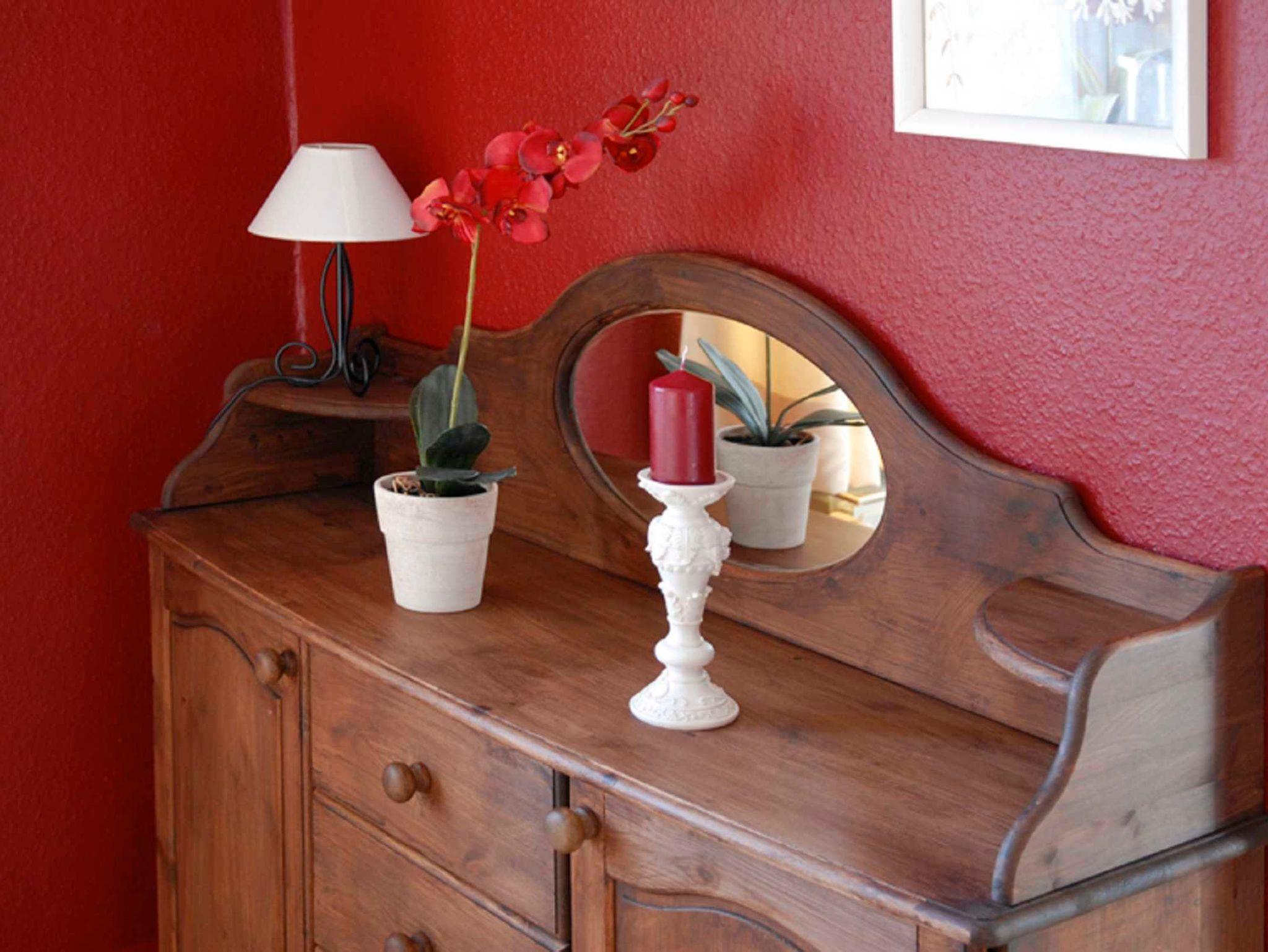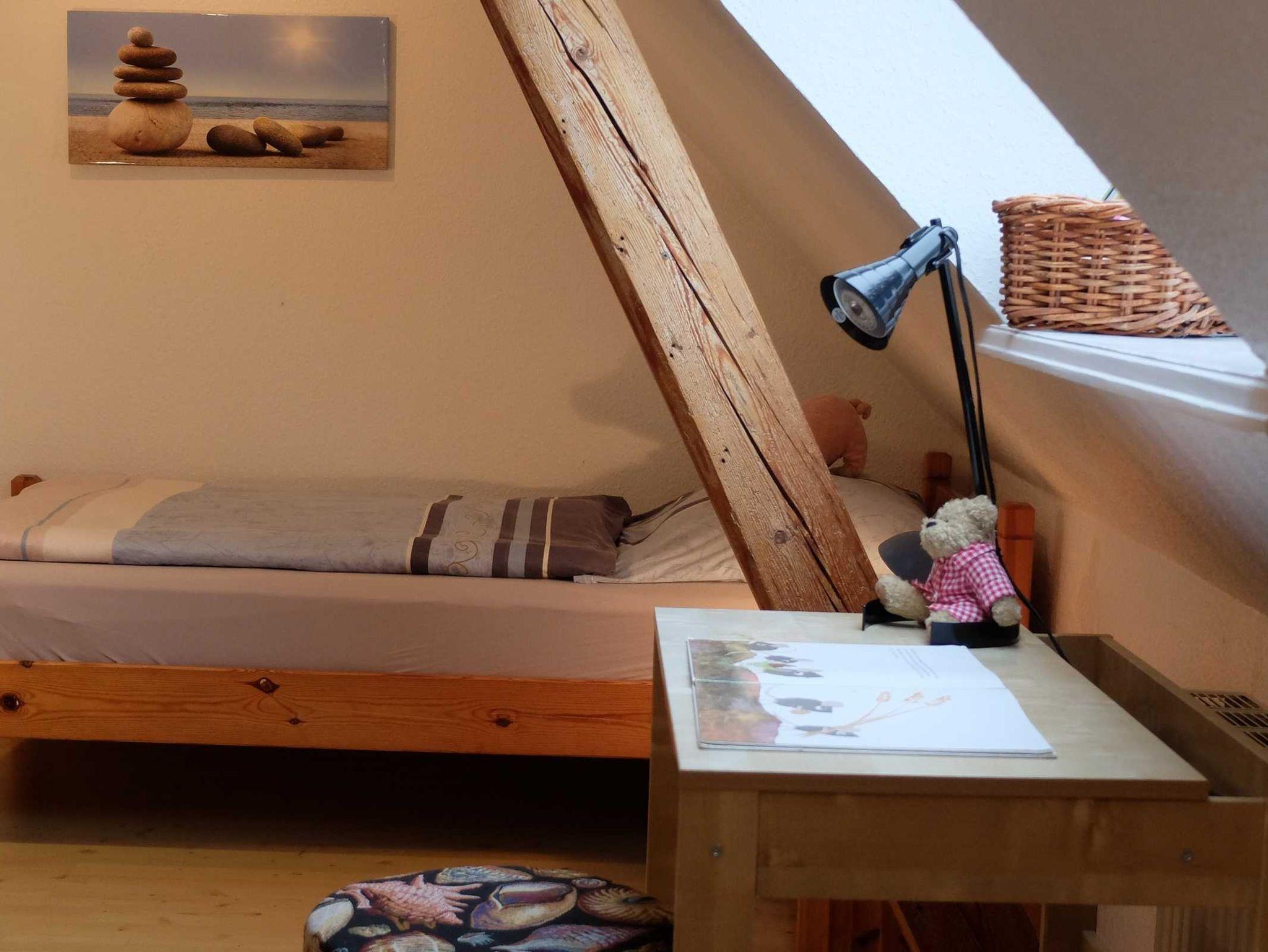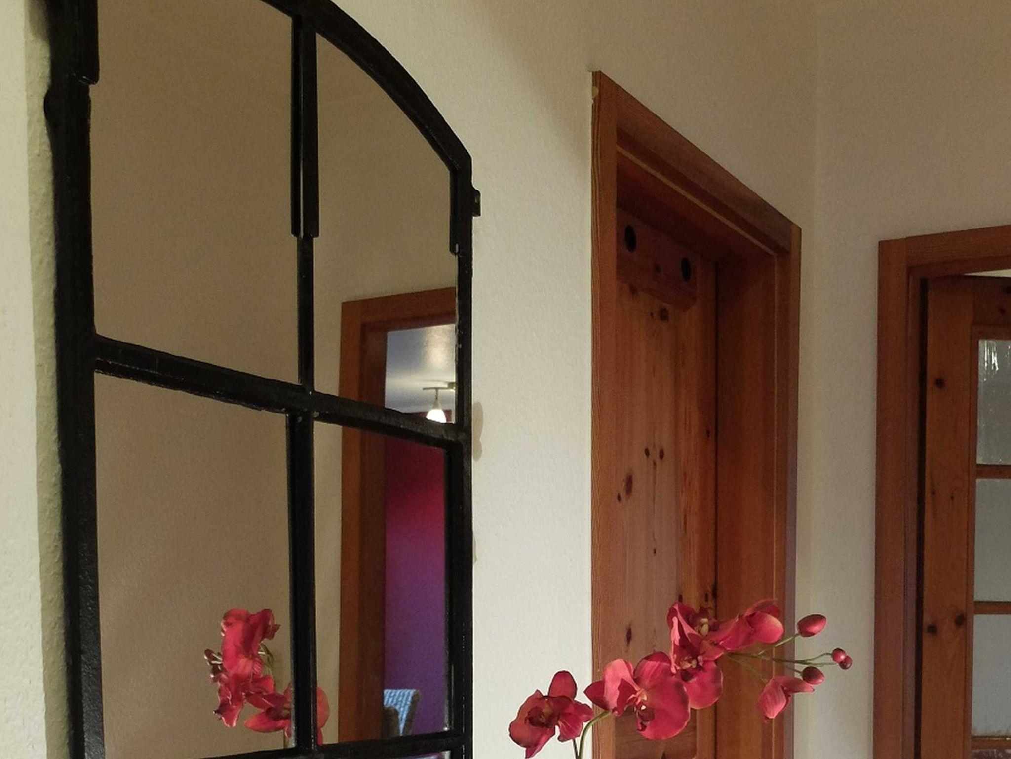 Die Ferienwohnung Gartenblick im Obergeschoss mit einem herrlichen Blick auf den Garten bietet bis zu 4 Personen viel Platz zum Wohlfühlen unter offenliegenden Holzbalken. Moderne und antike Elemente sind sehr gelungen mit warmen Farbakzenten in Rot kombiniert: