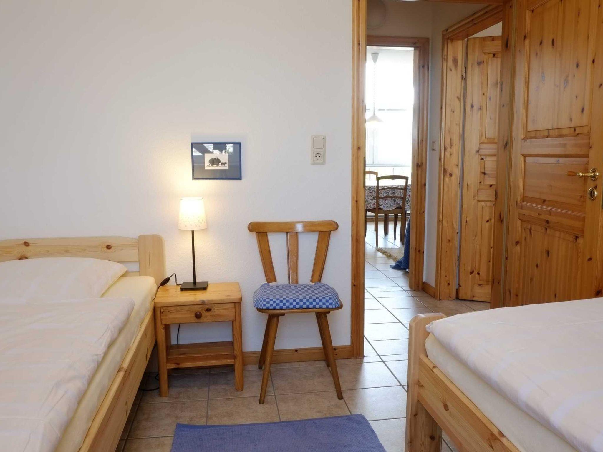 Unsere Ferienwohnung 1 liegt im ersten Stock und ist über eine Außentreppe zu erreichen. Es ist gleich die erste Wohnung am Aufgang. Die Fenster des Wohnraumes blicken nach Süden, die der Schlafzimmer nach Norden, und aus allen Fenstern blickt man auf die Ostsee. Auf der Südseite vor der Wohnung gibt es eine kleine Sitzmöglichkeit auf der Balustrade mit Blick auf die Ostsee. Der Fußboden in allen Zimmern ist gefliest. Die Wohnung verfügt über jeweils zwei Schlafzimmer, eines mit Doppelbett, eines mit zwei Einzelbetten, einen großzügigen Wohnraum und ein Duschbad. Im Wohnraum gibt es eine Fernsehecke mit einem Ecksofa, einen Essplatz für vier Personen, und eine kleine Küchenzeile. Zusätzlich hat die Ferienwohnung 1 noch eine kleine Leseecke.