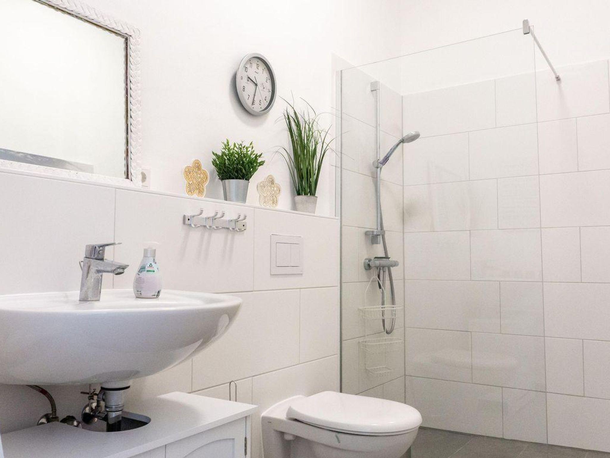 Das Bad ist mit einer bodentiefen Dusche, Handtüchern, Badetüchern, Haartrockner, Waschbecken und Spiegel hochwertig ausgestattet.