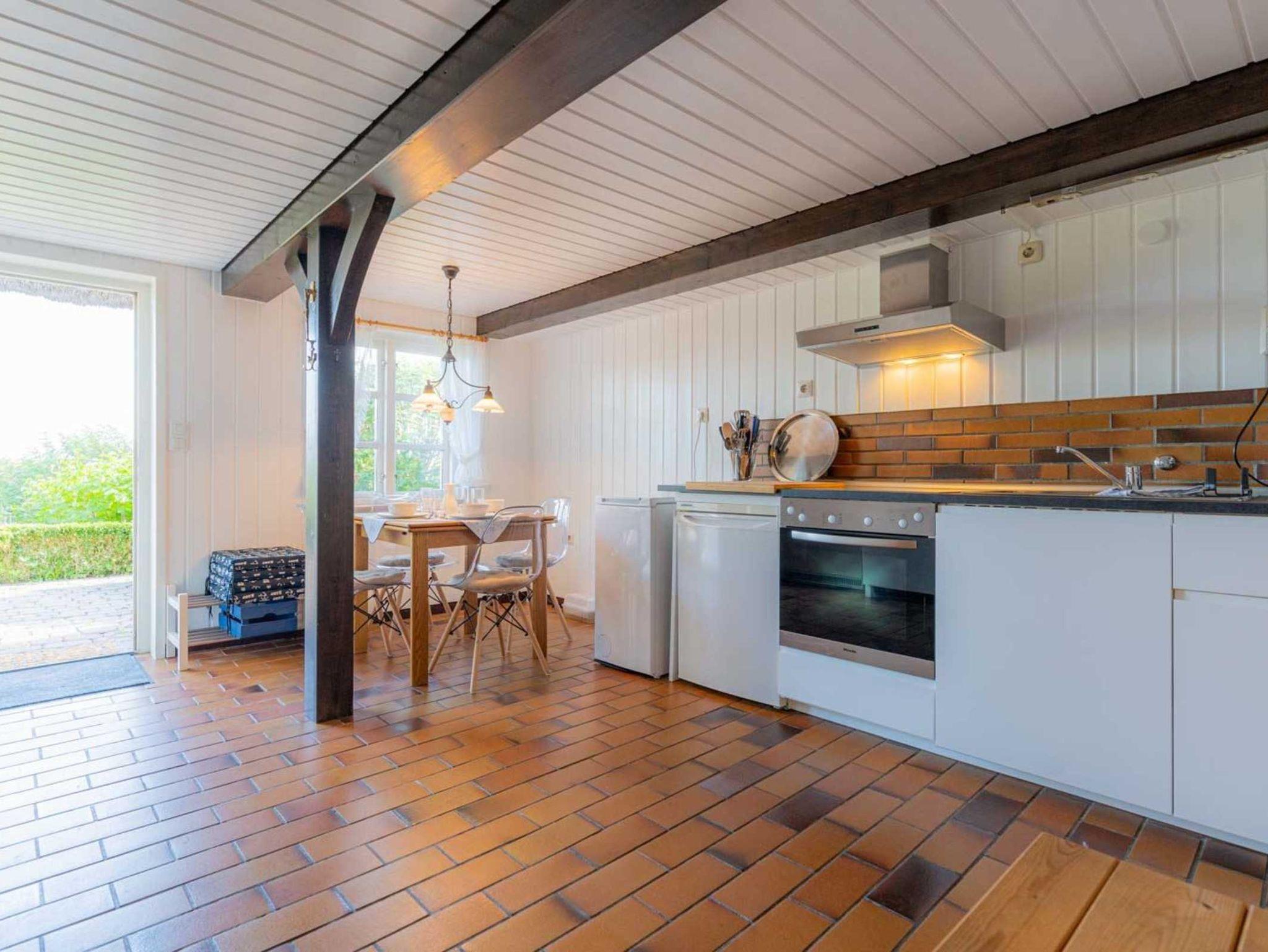 Separate Küche im Eingangsbereich mit Backofen, Mikrowelle, Kühlschrank mit Gefrierfach, Waschmaschine (TopLoader) und Esstisch mit 4 Stühlen. Haushaltsschrank mit Staubsauger. Direkter Zugang zur möblierten Gartenterrasse nach Osten mit Blick über die Marschwiesen.