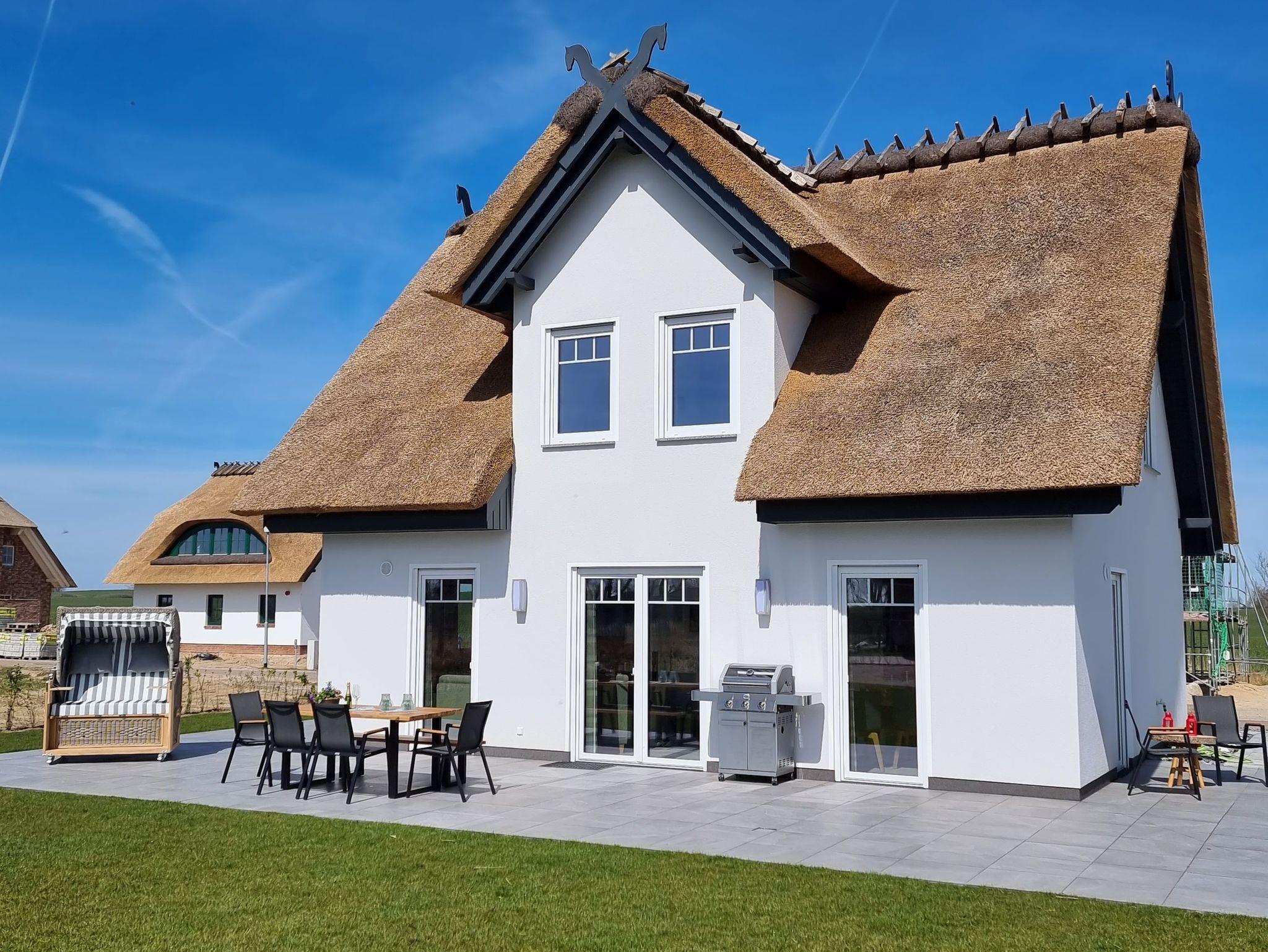 Neu erbautes Komfortferienhaus unter Reet mit großem Wohn-Essbereich, integrierter Küche, Kaminofen, 3 Schlafzimmern für insgesamt 6 Personen, 2 Bädern, jeweils mit bodengleicher Dusche, großem Grundstück (ca. 1000 m²) großer Terrasse, Gasgrill, Gartenhaus mit Sauna, Strandkorb.