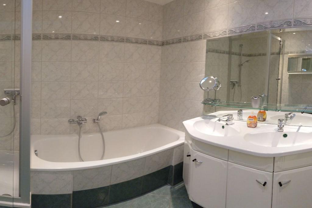 Faciliteter: Ferielejlighed (ca. 75 kvm) Stor stue med Telekom Magenta og Wi-Fi Dobbelt sovesofa Soveværelse med dobbeltseng Børneværelse med køjeseng Meget rummeligt badeværelse med dobbelt håndvask, badekar og bruser samt håndklædetørrer Stort, fuldt udstyret køkken med køleskab/fryser, keramisk kogeplade, ovn, opvaskemaskine, mikrobølgeovn, kaffemaskine, elkedel, tallerkener, gryder, pander og bestik, radio Gulvvarme i hele lejligheden, parkeringsplads foran døren, 25 kvm terrasse, havemøbler og tørrestativ til tøj til rådighed