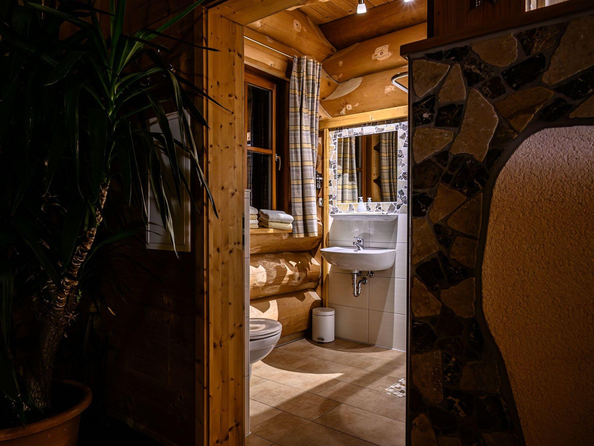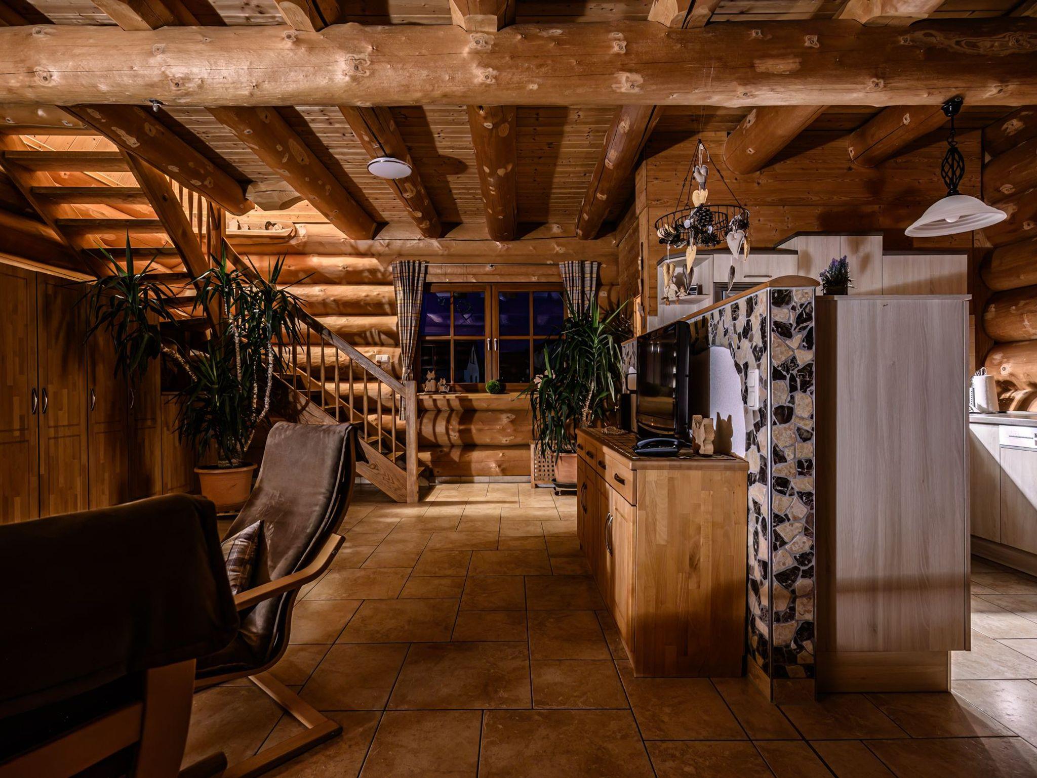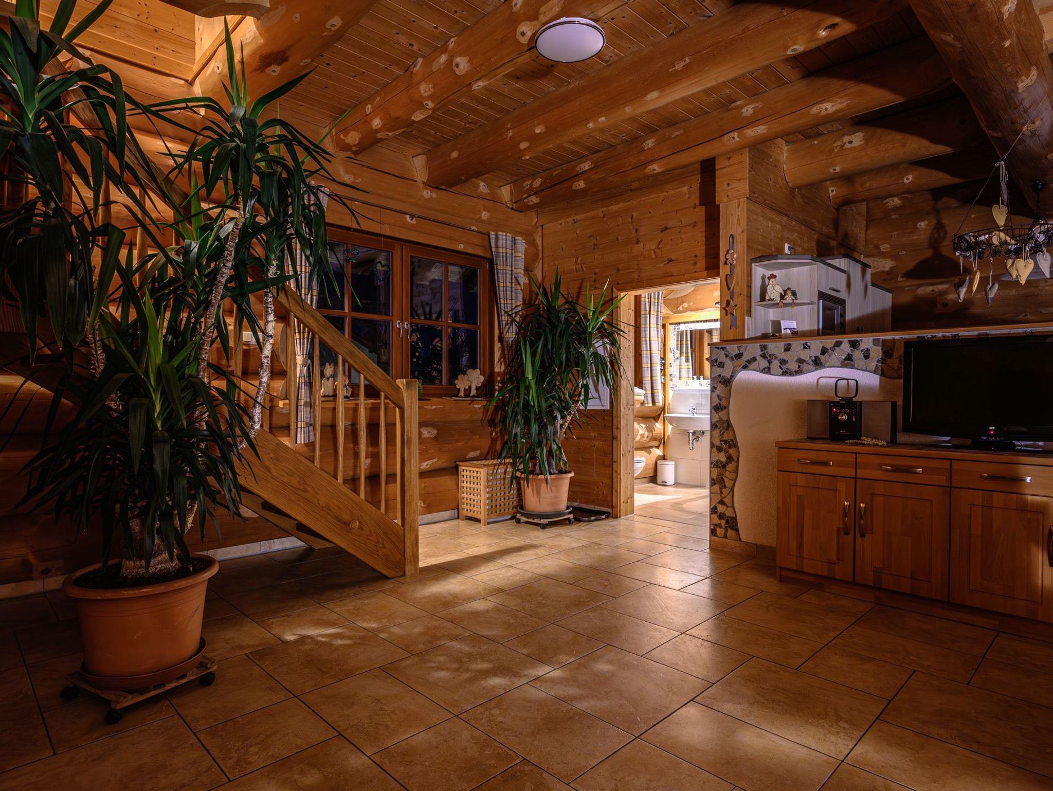 Das gesamte Naturstammhaus verfügt über Fußbodenheizung .