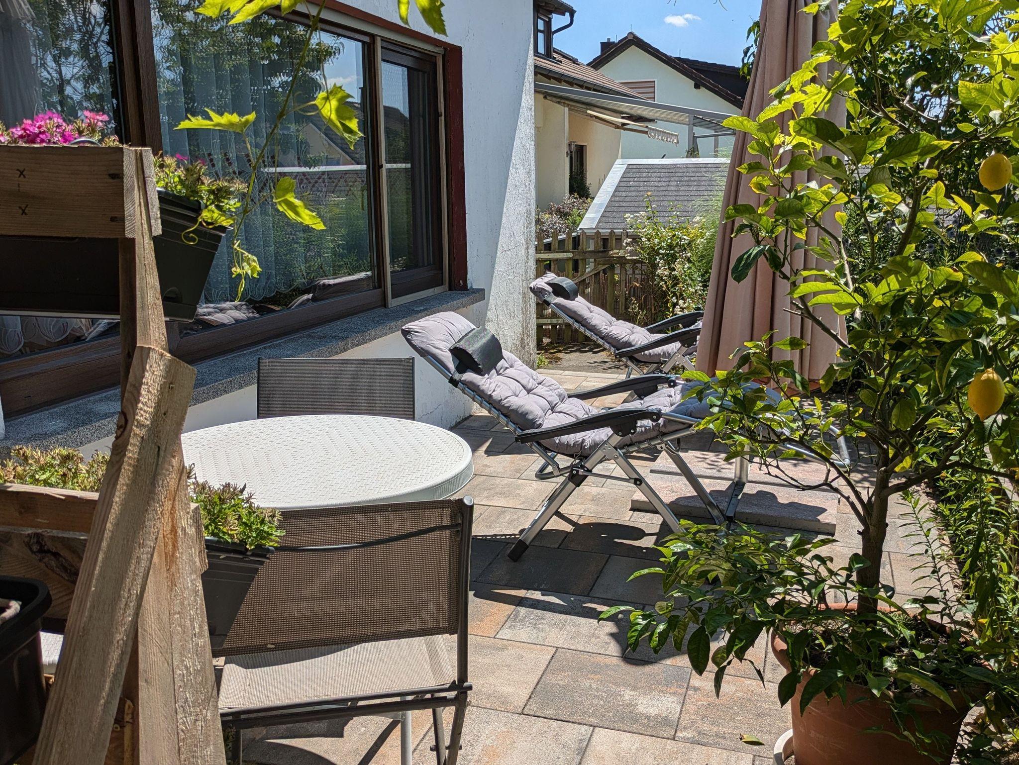 Rechts neben dem Eingangsportal befindet sich die 12 qm große Terrasse mit großem Sonnenschirm und Relax- Liegen. Tisch und Stühle laden zum Frühstücken im Freien ein.