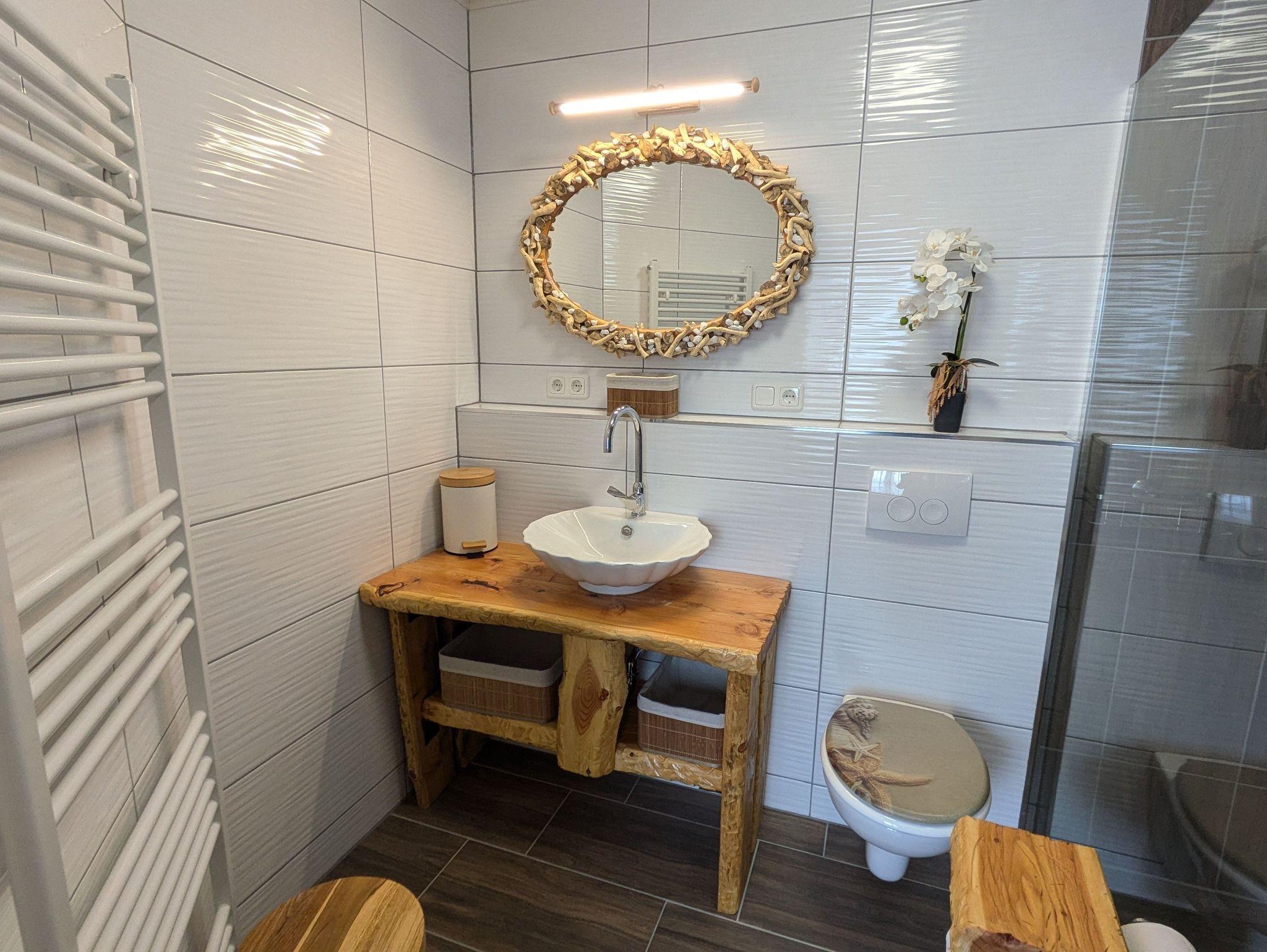 Das helle Bad betreten sie durch eine Glasschiebetüre. Dahinter verbirgt sich eine Walk-In Dusche mit Regenbrause. Eine Glasscheibe getrennt Dusche und Waschbereich. Eine Waschschale in Muschelform ziert den massiven Waschtisch aus Lärchenholz.