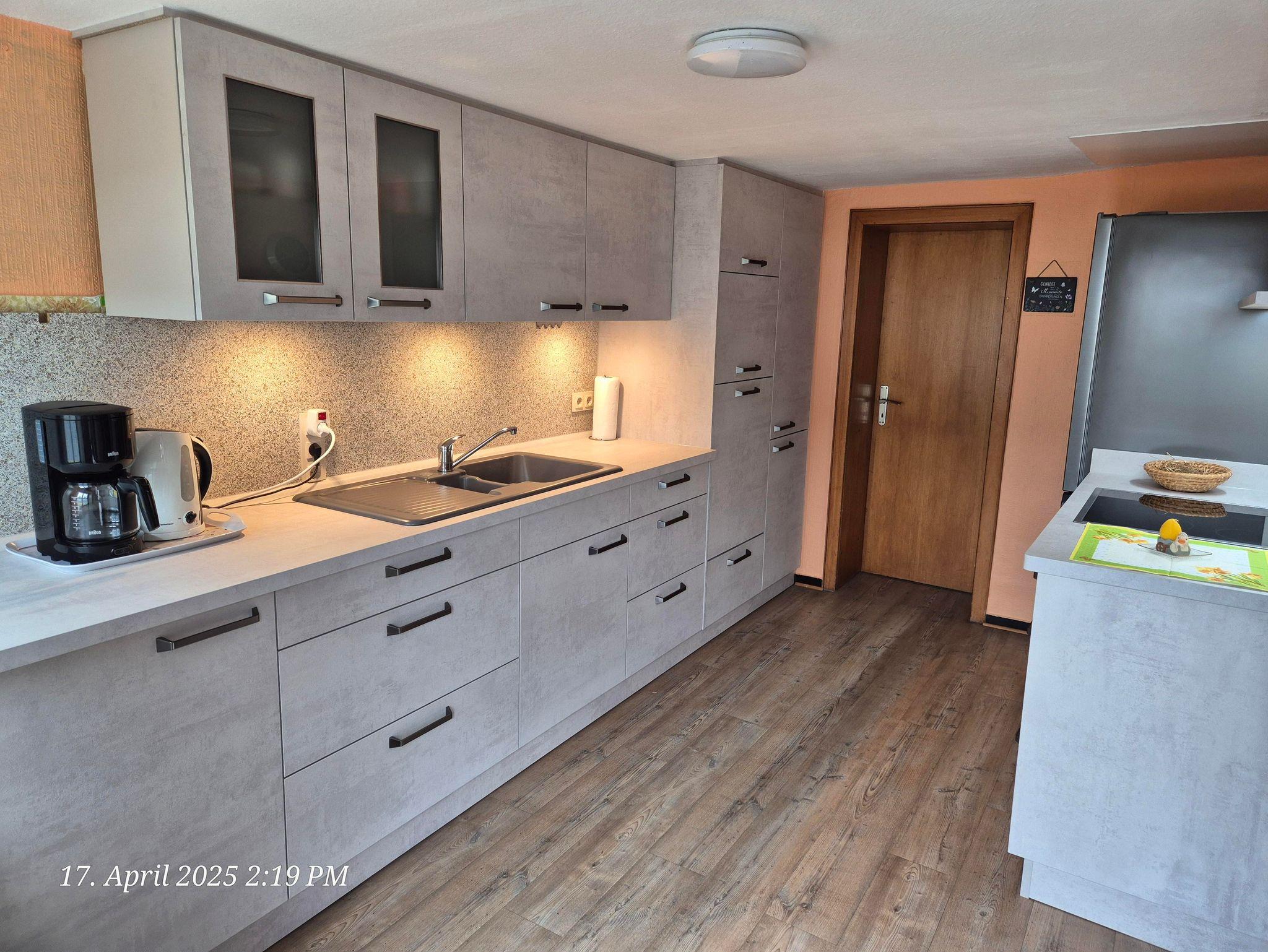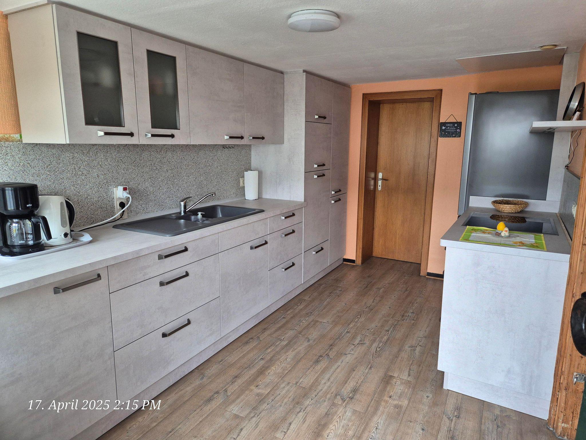 Einbauküche, Elektroherd mit 4 Platten und Backofen, Wasserkocher, Kaffeemaschine, Spülmaschine, Mikrowelle sowie Porzellan,