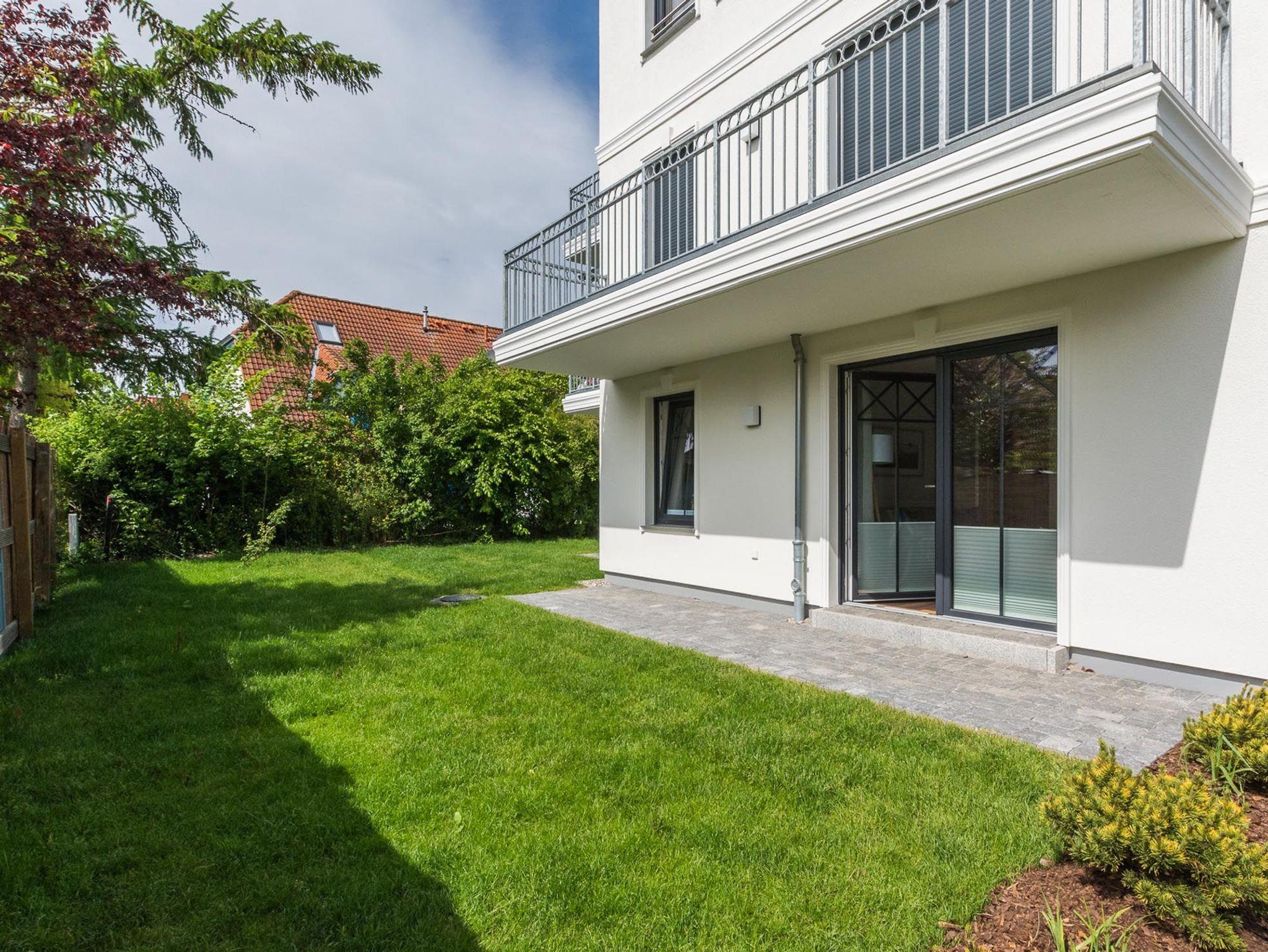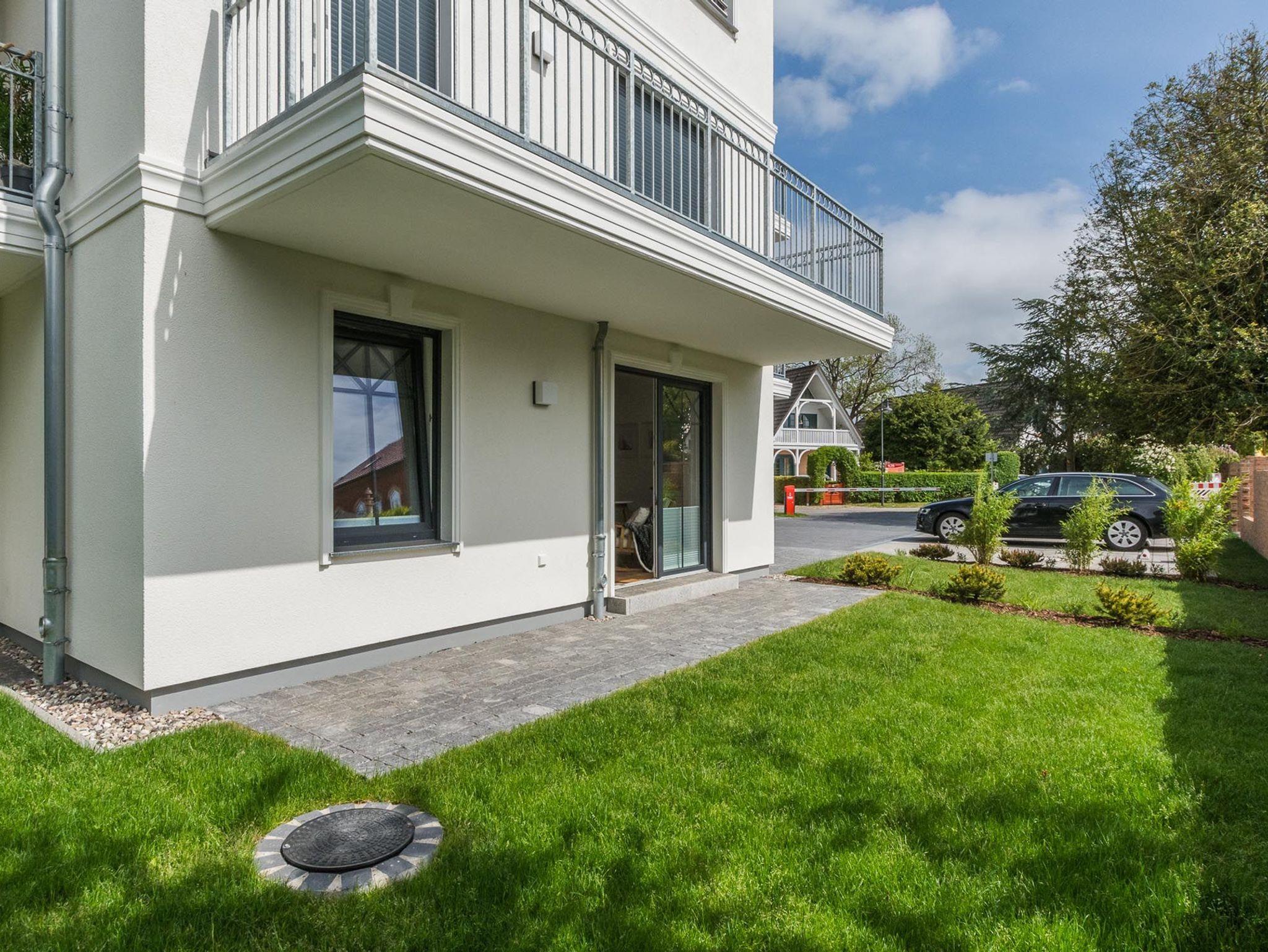 Vom Wohnzimmer aus hat man direkten Zugang zur möblierten Sonnenterrasse mit kleinem Vorgarten.