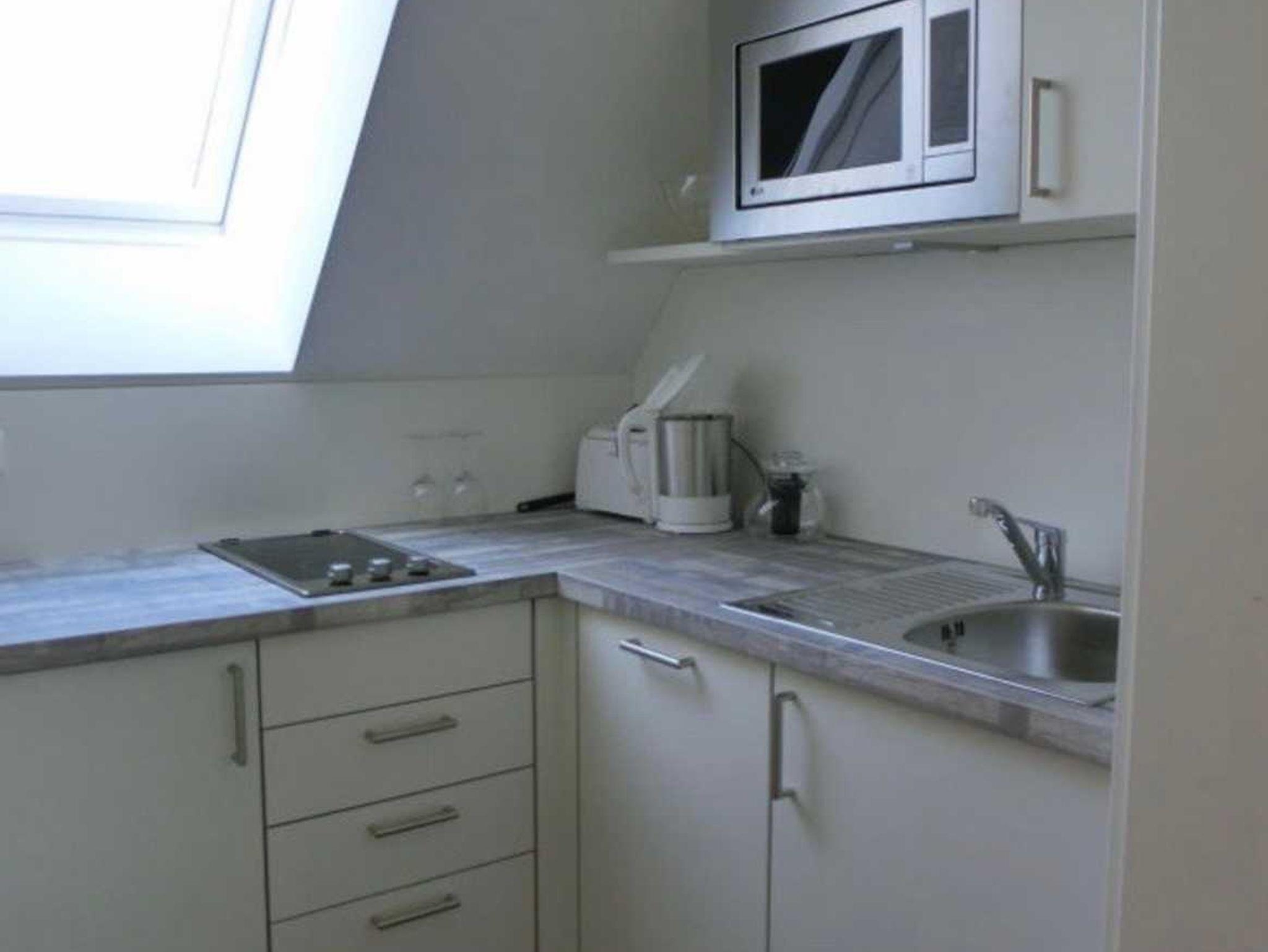 Der gemütliche Charakter wird duch die schrägen Decken in der ganzen Wohnung unterstrichen. Das helle Wohnzimmer ist mit einem Sofa, Sessel, TV und einer Eßecke ausgestattet. Von hier aus gelangen Sie auf den kleinen Südbalkon. Die kleine Küche ist mit einem 2 Plattenherd, Mikrowelle, Kaffeemaschine und Kochutensilien ausgestattet. Im Schlafzimmer gibt es ein Doppelbett (160x200) und einen Kleiderschrank. Das helle Bad überzeugt mit einem großen Fenster und einer bodentiefer Dusche.