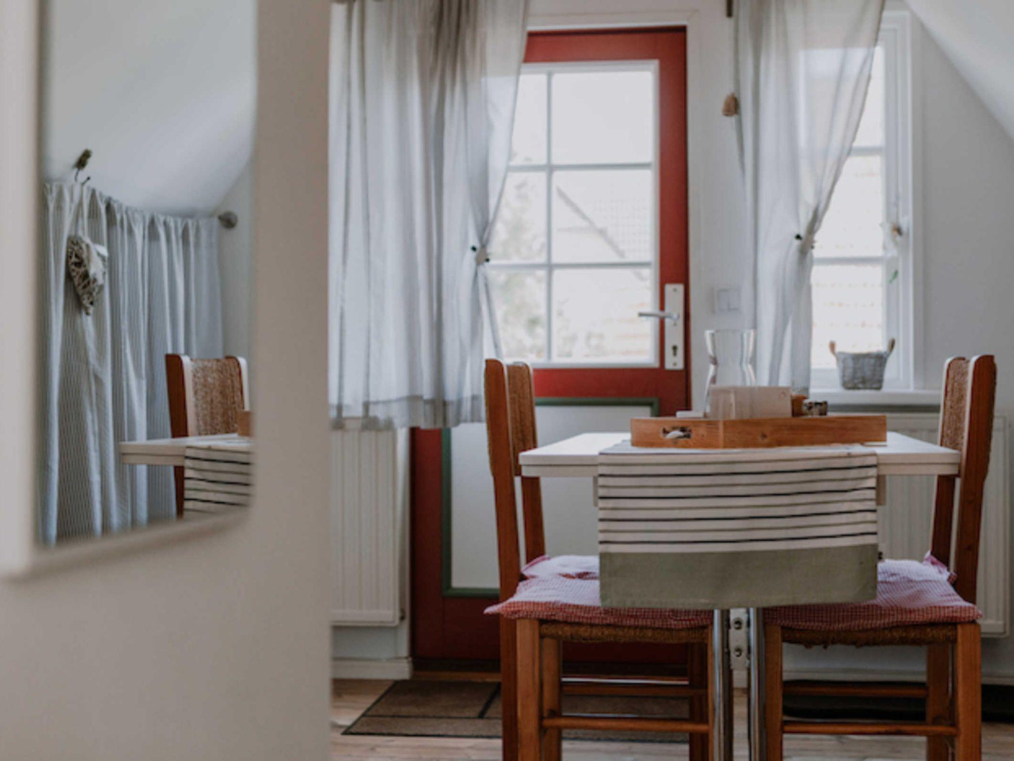 Die moderne Küche ist großzügig ausgestattet, für alles Frische, was aus dem Meer direkt auf den Tisch kommen soll. Vom Esstisch genießen Sie durch die verglaste Darsser Tür die Morgensonne und den Blick auf Prerow´s Grün. Hier erwartet Sie außerdem etwas ganz Typisches: 2 Alkoven – in die Dachschräge eingebaute Schlafnischen dienen Ihnen oder Ihren Kindern als eine besondere Schlafgelegenheit.