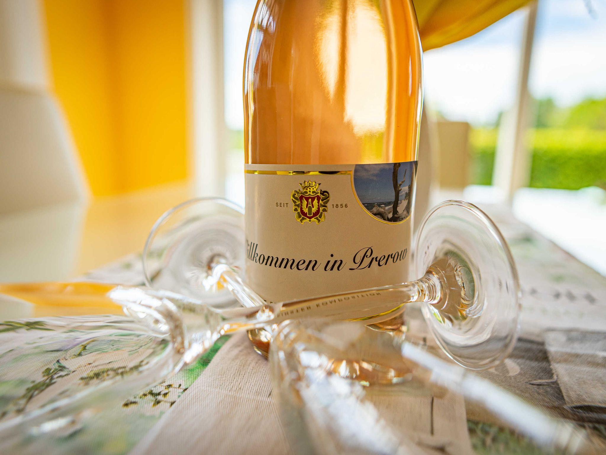 Das exklusive Ferienhaus erwartet seine Gäste auf einem ruhig gelegenen Grundstück, am Rande einer Wiese, mit traumhaftem, freiem Blick über die Wiese zum Rand des Darßer Waldes.