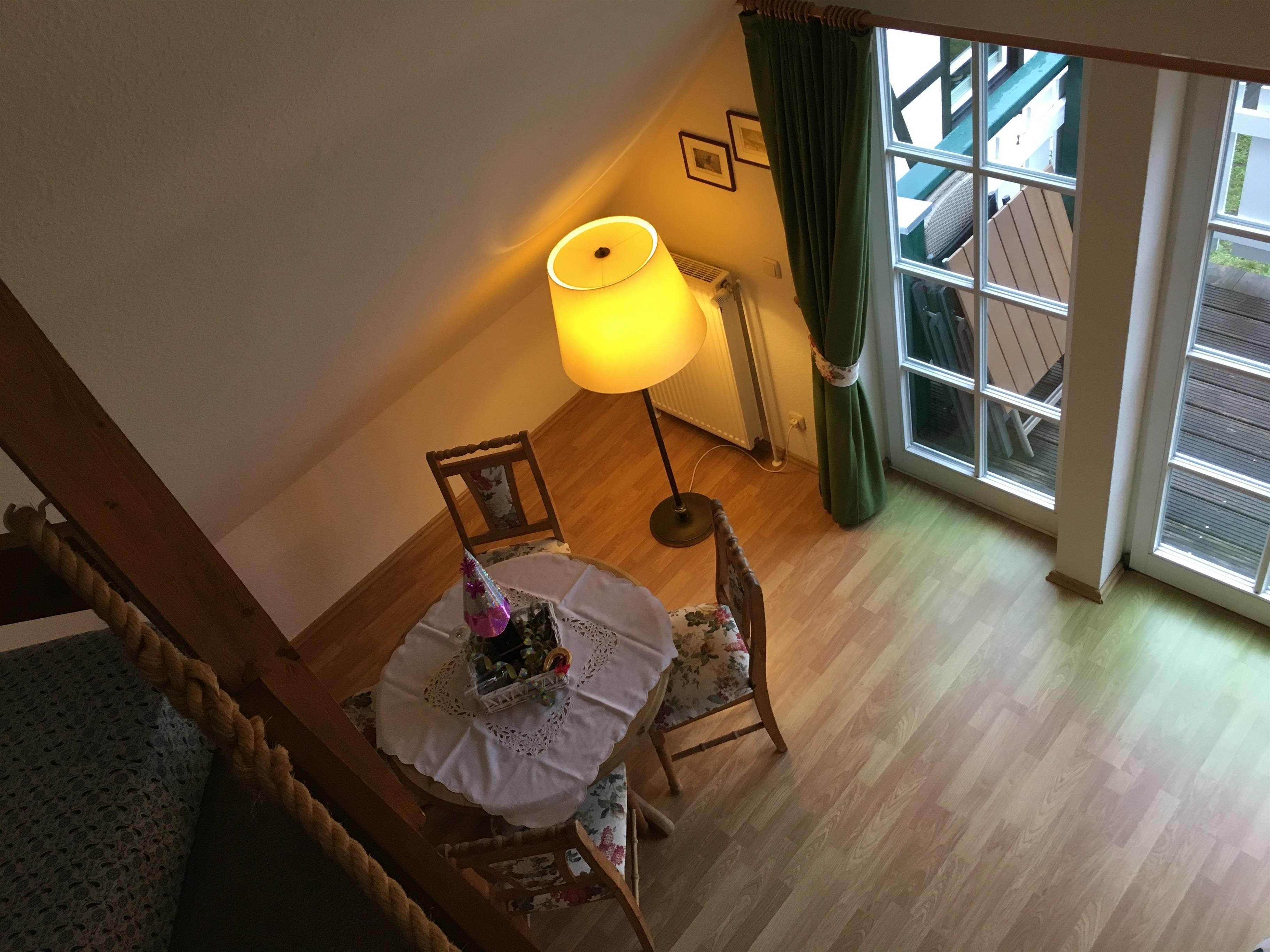 Der bis ins Dach hinein offene Wohnraum der Ferienwohnung \"über Deck\" ist mit seiner sehr gemütlichen Sitzecke und den antiken Weichholzmöbeln im Landhausstil gehalten. Erreichbar über eine separate Außentreppe, ausgestattet mit funktionaler Küche und einem großzügigen Balkon, bietet die Wohnung Platz für bis zu 4 Personen. Durch die zwei gut getrennten Schlafbereiche ist die Ferienwohnung auch für Pärchen oder Eltern mit großen Kindern geeignet. Bitte beachten Sie, dass ein Wäschepaket mit Handtüchern und Bettwäsche optional angeboten wird, sprechen Sie uns an.