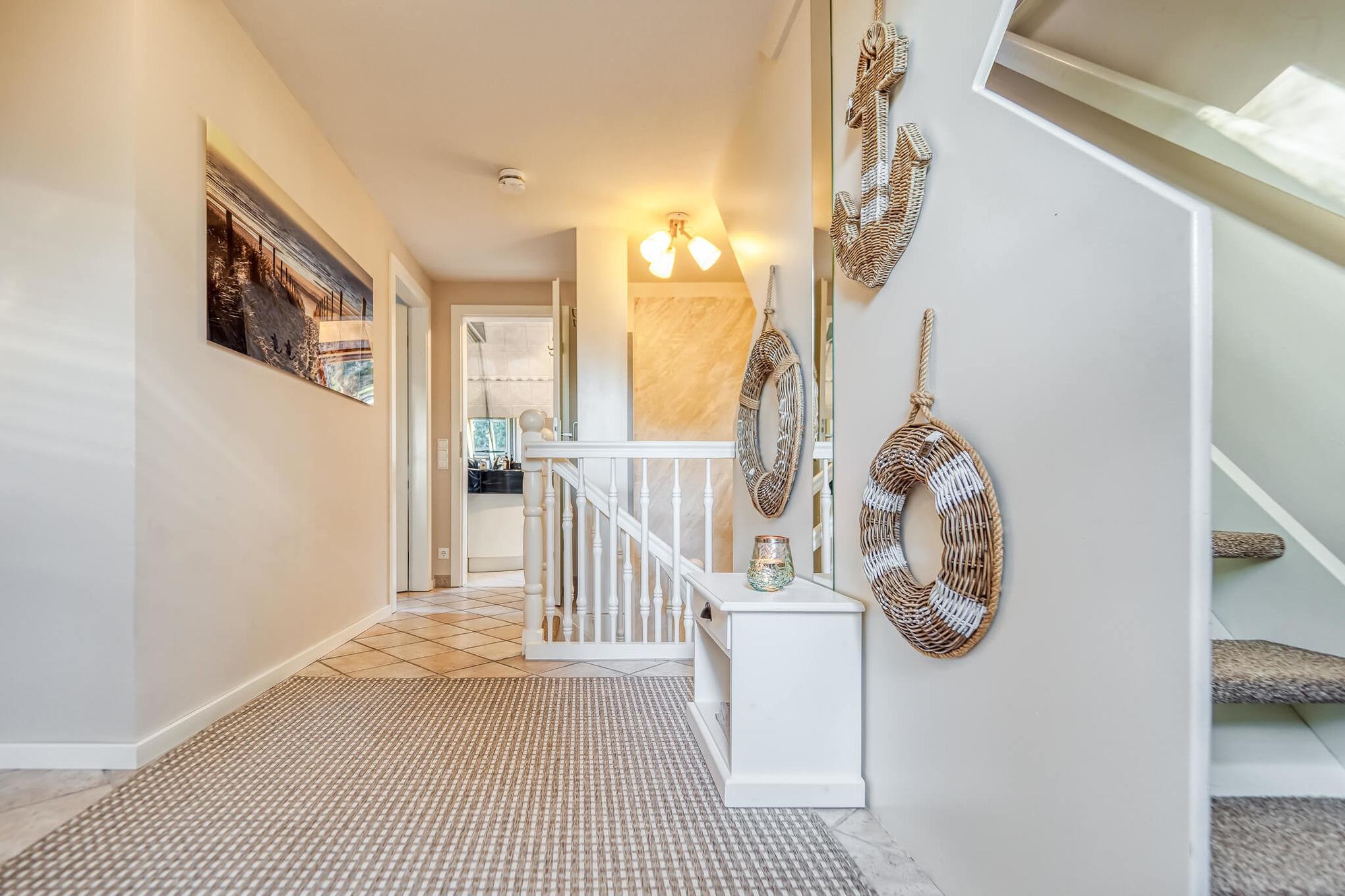 Im Obergeschoss finden Sie das helle und in modernem maritimem Stil eingerichtete Wohnzimmer. Eine gemütliche Couchecke mit Sessel und Sat-TV laden zum Ausruhen nach einem erlebnisreichen Tag auf dem Darß ein. Mit SAT-TV, Radio, CD, Bluetooth und WLAN ist die Wohnung technisch an die heutige Zeit angepasst.