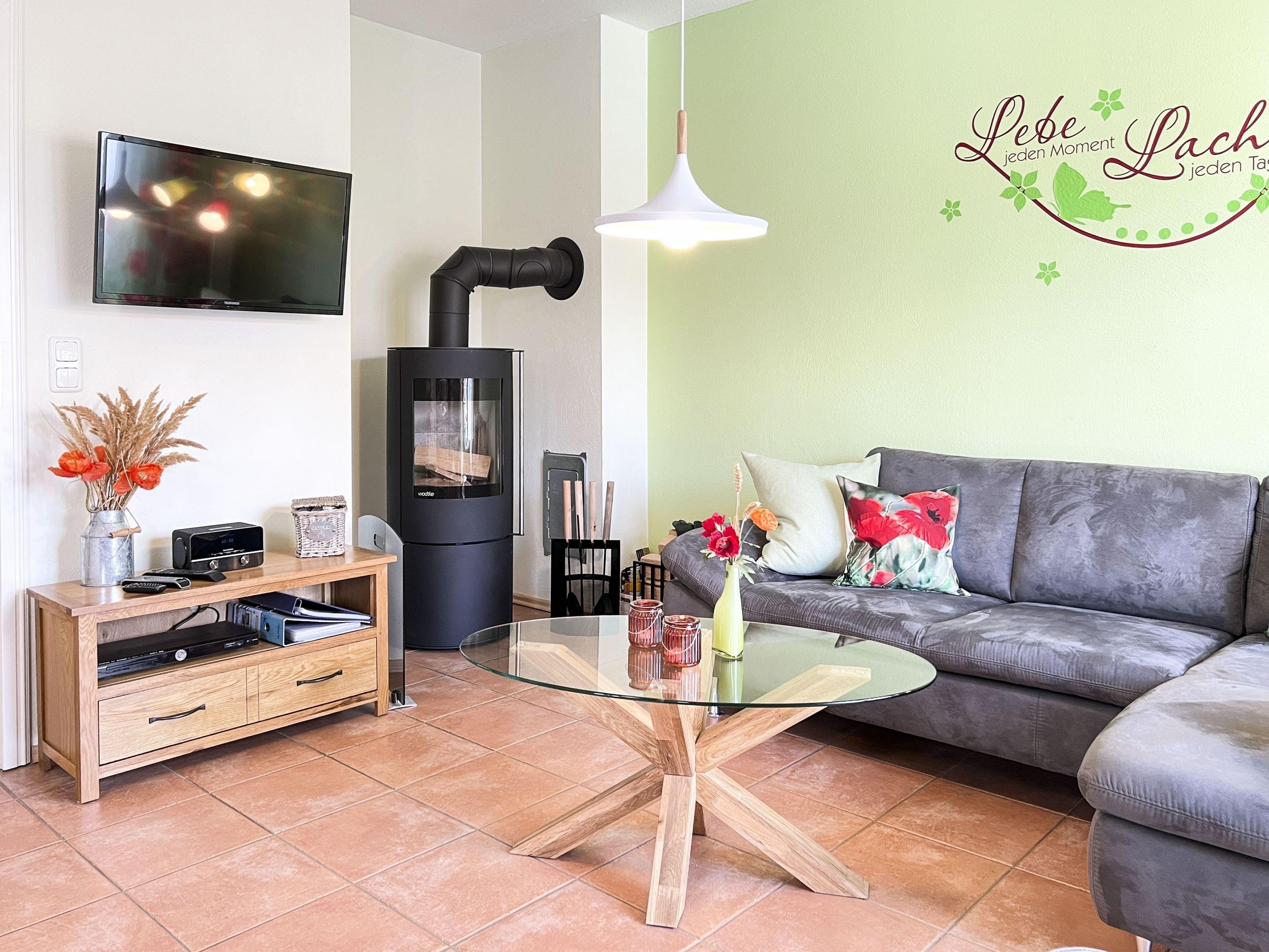 Wohnbereich: Heller Wohnraum mit Kamin, Smart-TV und bequemer Sitzgruppe