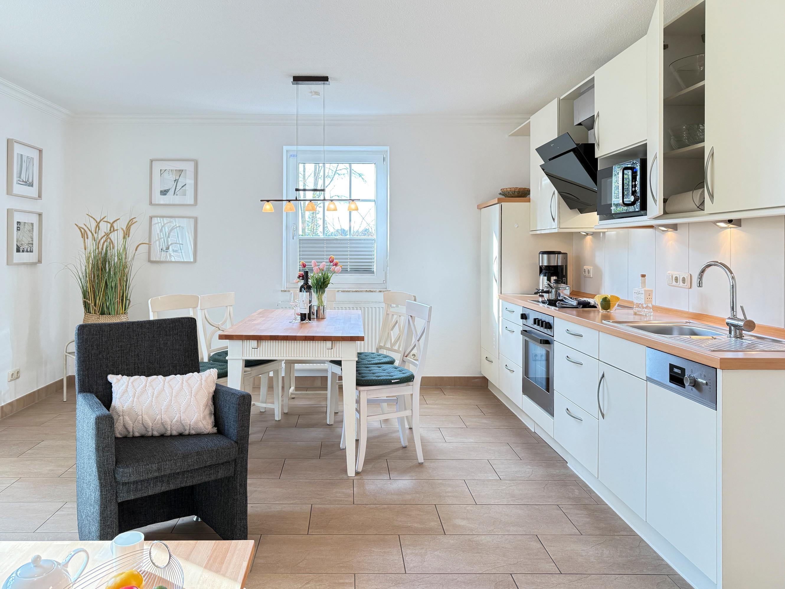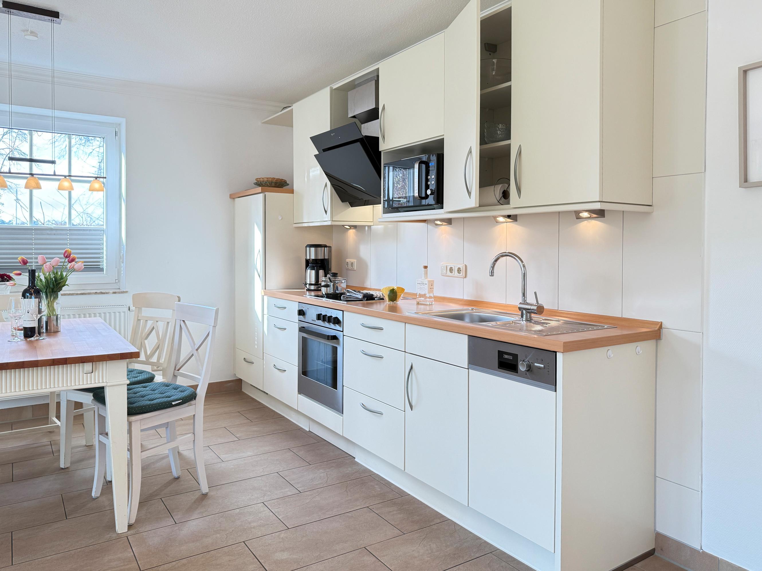 Küche und Essbereich: Voll ausgestattete Küchenzeile mit Backofen, Kochfeld, Geschirrspüler, Kühlschrank mit Gefrierfach, Mikrowelle, Filterkaffeemaschine, Toaster, Wasserkocher und Küchenmixer; Essbereich für gesellige Mahlzeiten