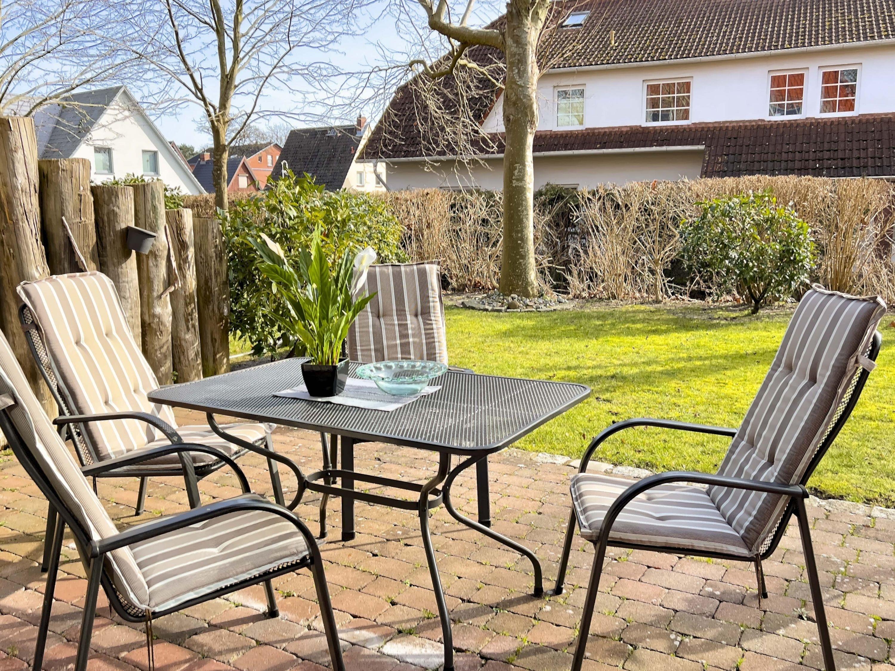 Terrasse und Garten: Private Terrasse mit Gartenmöbeln und Blick ins Grüne, ideal zum Entspannen; Zugang zum Garten