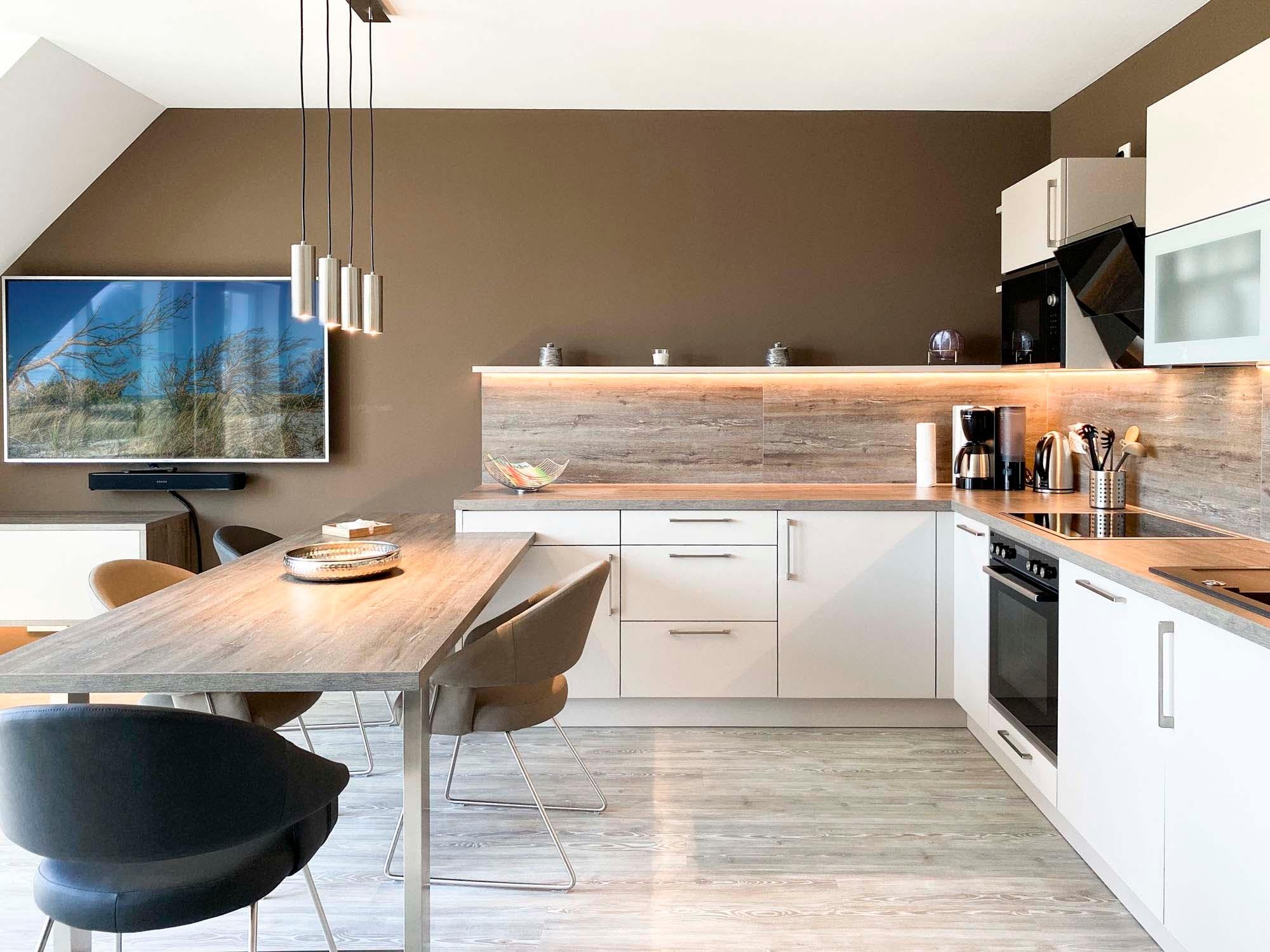 Küche: Voll ausgestattete Küchenzeile mit Induktionskochfeld, Backofen, Geschirrspüler, Kühlschrank mit Gefrierfach, Mikrowelle, Filterkaffeemaschine, Toaster und Wasserkocher