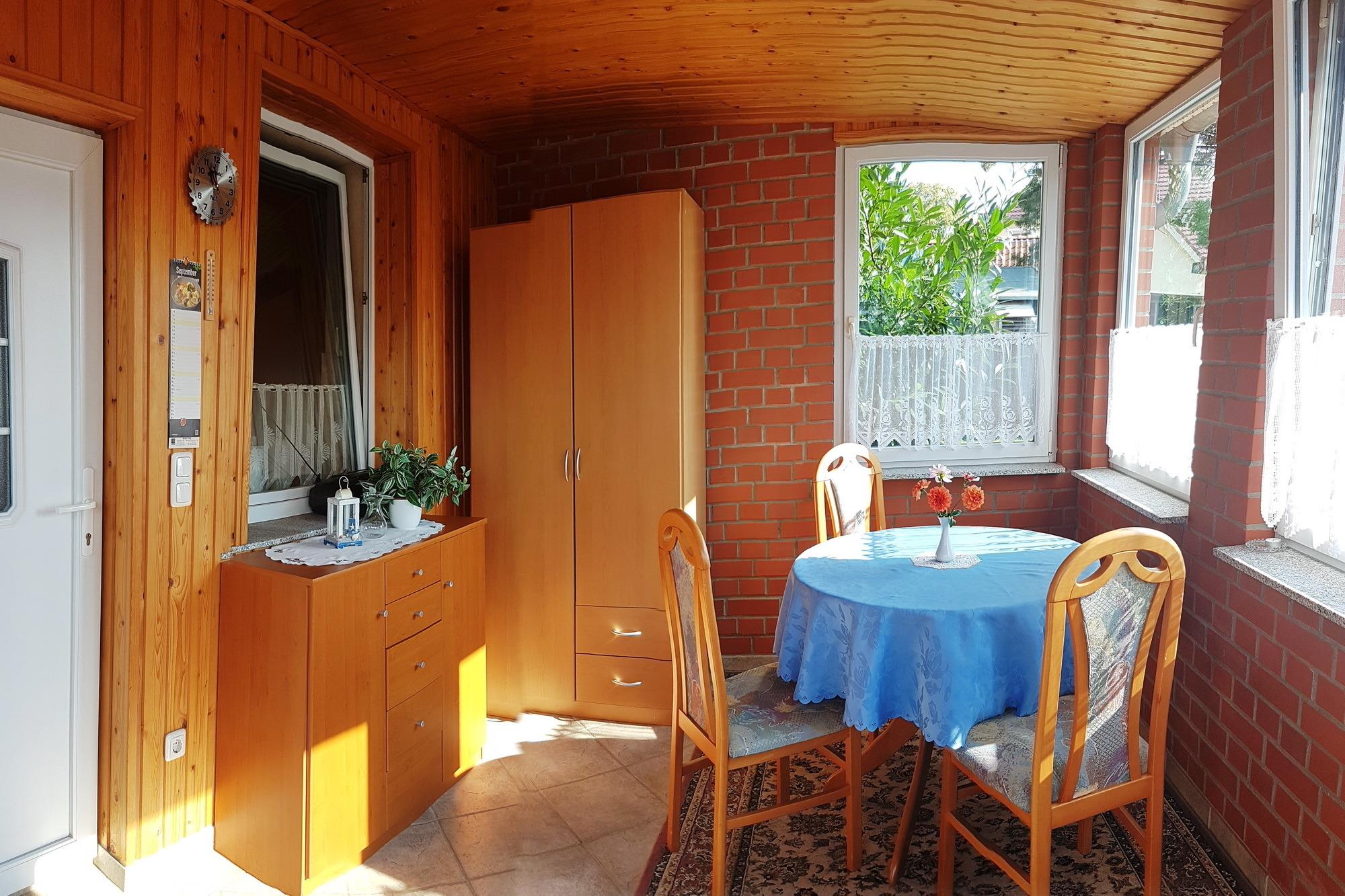 In der Veranda im Eingangsbereich ist eine Sitzecke, wo man gemütlich essen kann. Gemütlich eingerichteter Wohnraum mit SAT-TV. Die komplett ausgestattete Küchenzeile befindet sich ebenfalls im Wohnraum.
