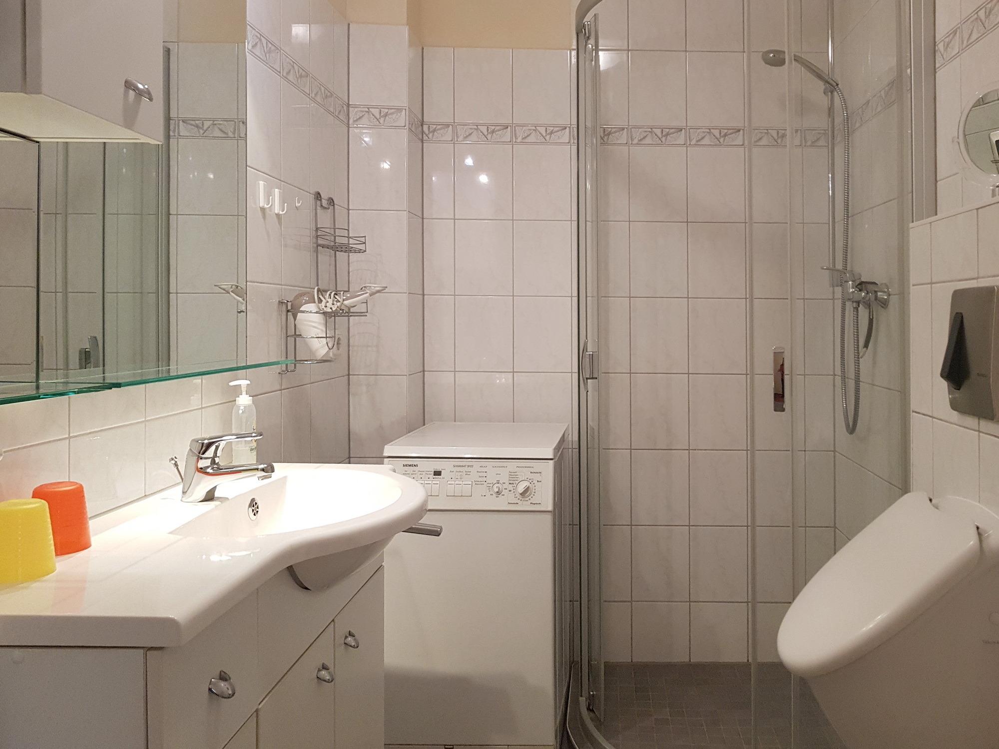 Das Bad ist mit Dusche, WC, Bidet und Waschmaschine ausgestattet. Ein PKW-Stellplatz und ein Fahrradschuppen sind vorhanden.