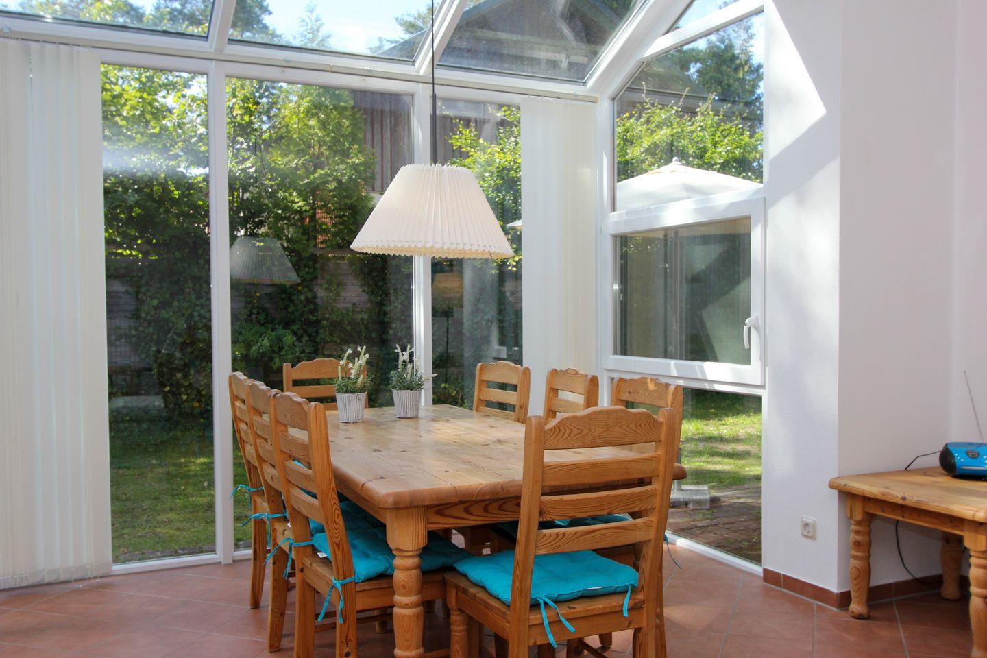 Für einen erholsamen Urlaub erwarten Sie im Erdgeschoss des Hauses ein großer, offener Wohnbereich mit gemütlicher Fernsehcouch, Sitzplätzen zum Lesen an einem Kaminofen und ein großer Esstisch im angrenzenden Wintergarten.