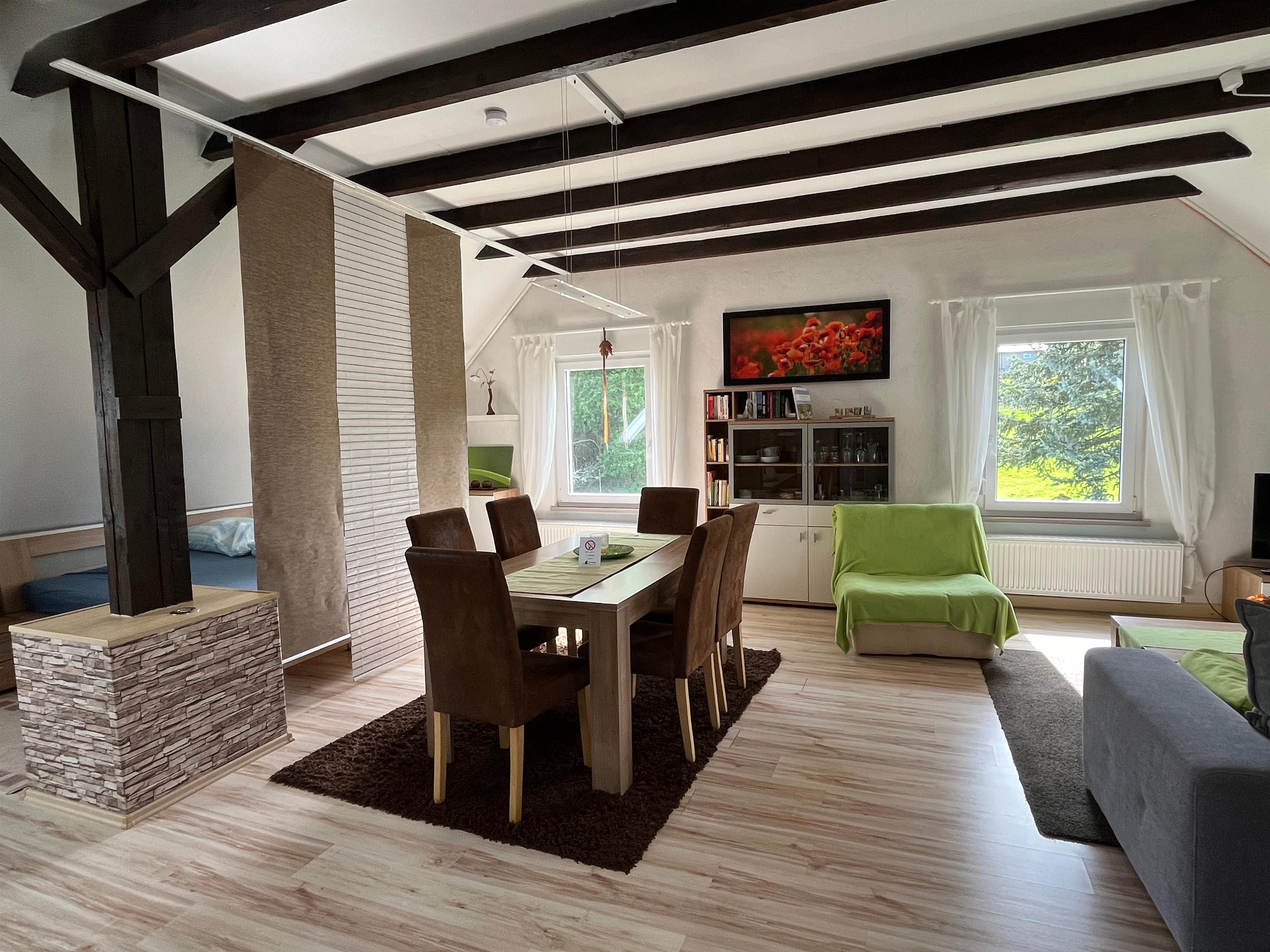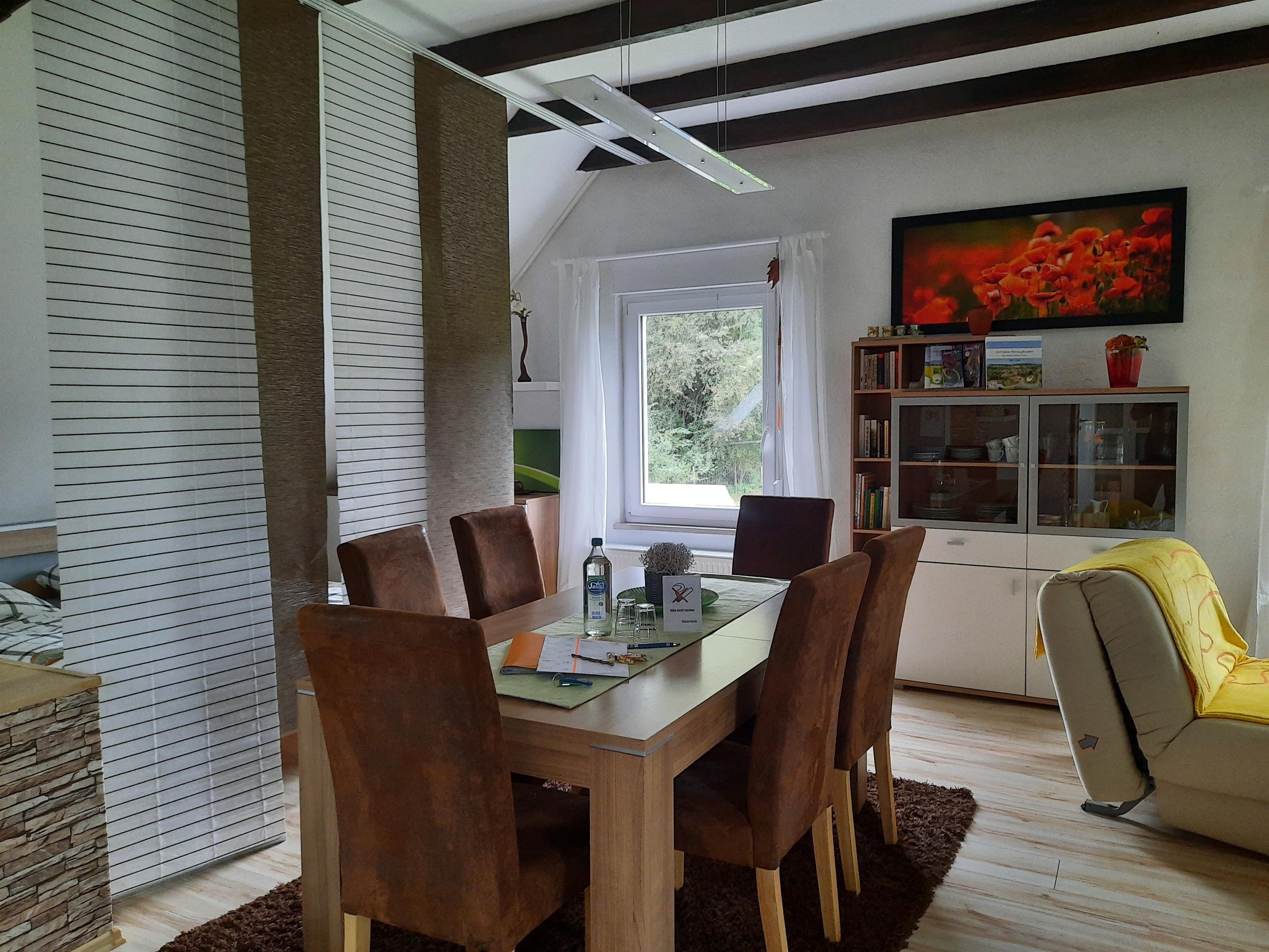 Der Essbereich besteht aus einem großen Tisch mit 6 Stühlen an dem reichlich Platz zum Essen und spielen vorhanden ist.