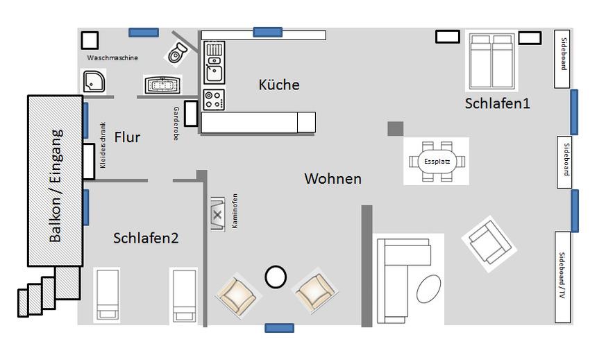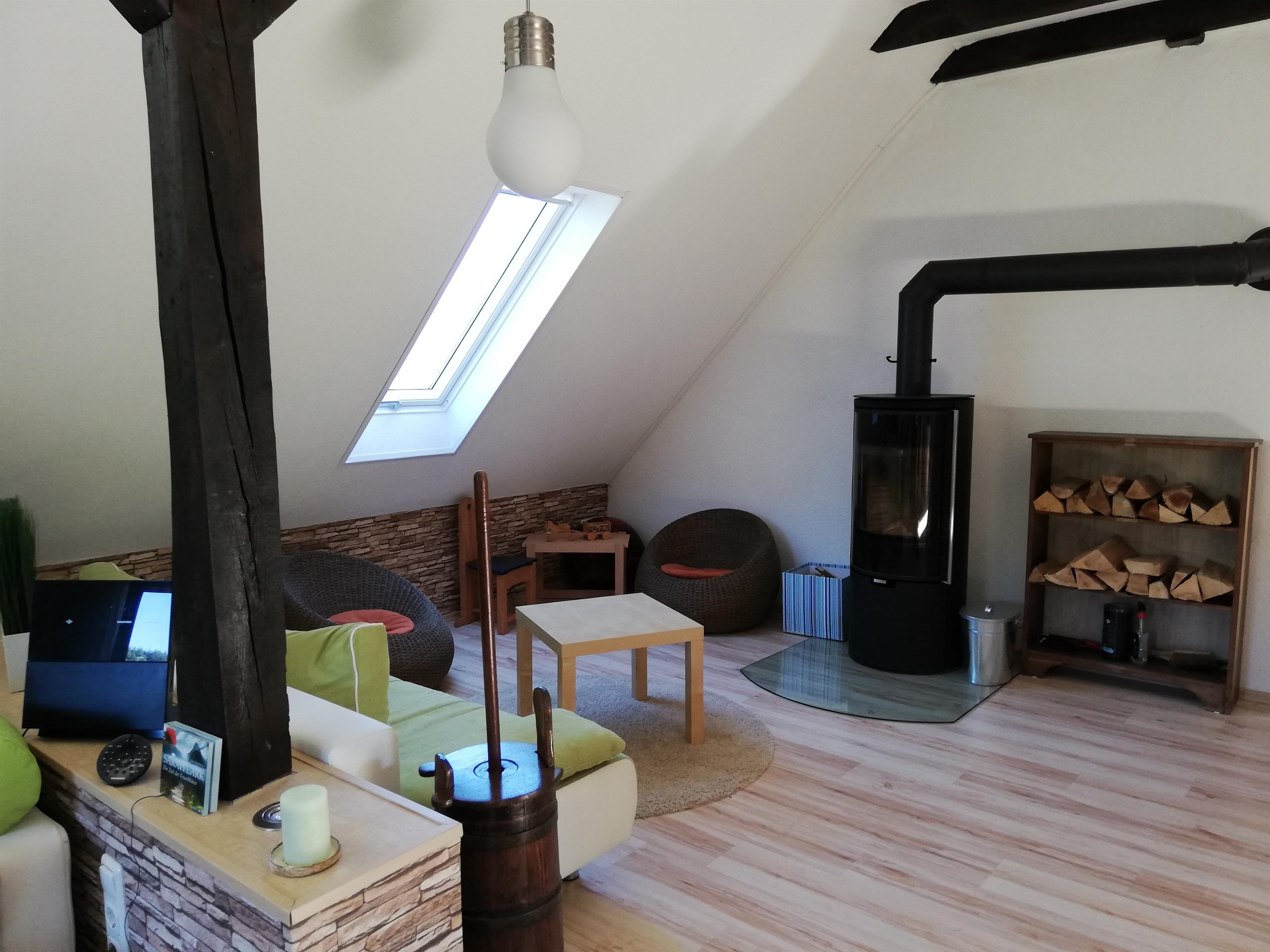Weiter gibt es ein Schlafsofa (140x200) und Coktailsesseln, die dazu einladen einen Abend am vorhandenen Kamin zu verbringen.